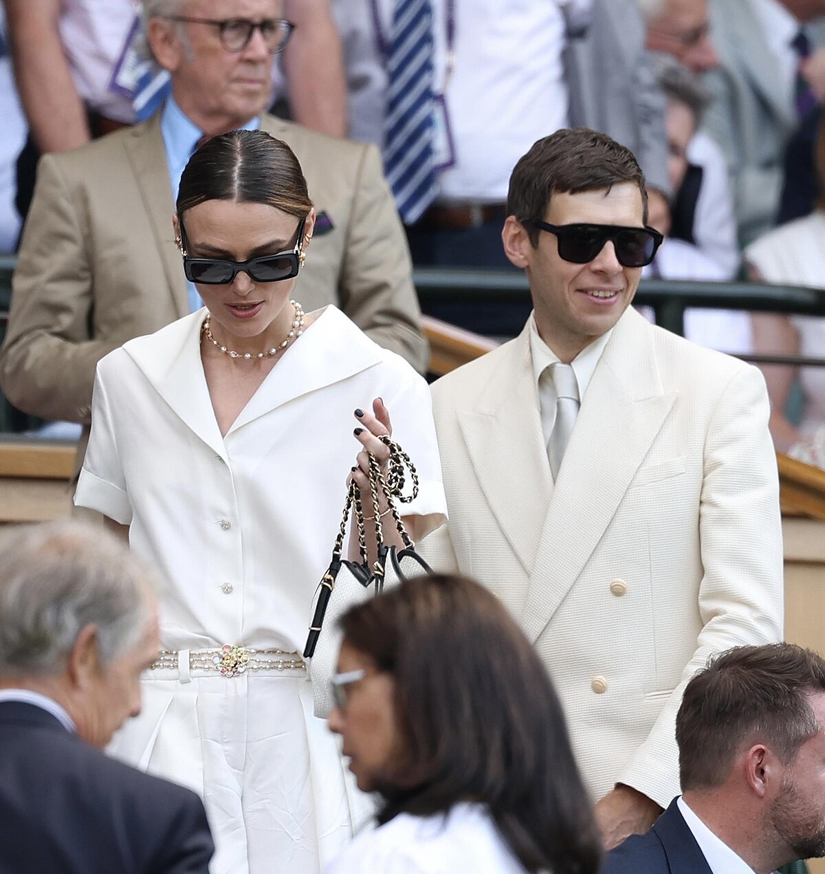 演員Keira Knightley一襲Chanel的洋裝,與老公James Righton一起穿著全白outfit,並以珍珠項鏈、金飾點綴,略顯粗獷的方框墨鏡則為整體造型帶來絕妙的風格平衡。