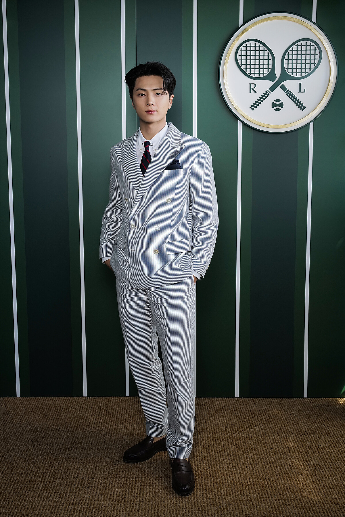 Jay穿著Ralph Lauren條紋雙排扣西裝搭配標誌性領帶,展現低調而精緻的紳士面貌。