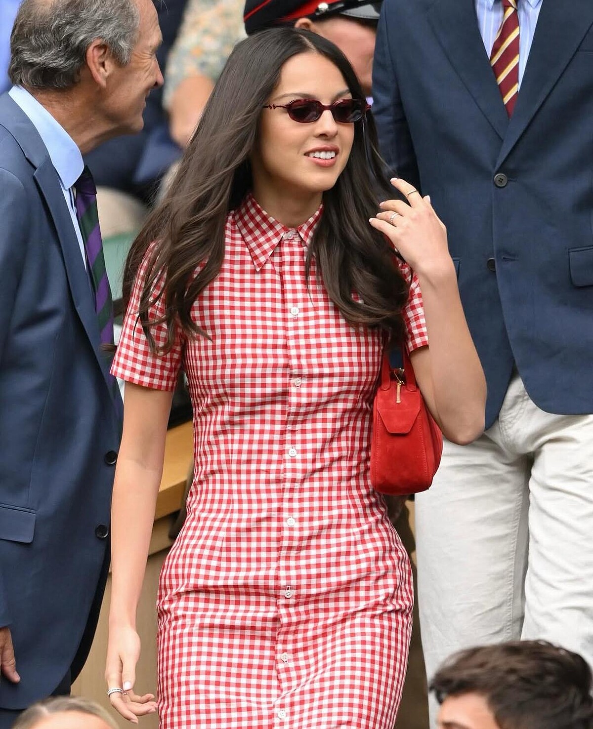 新生代女神Olivia Rodrigo穿著Ralph Lauren的紅色格紋襯衫裙,搭配深紅色墨鏡、紅色麂皮手袋,搭配出溫網場邊少見的All Red風格,不過也更貼合她的青春少女氣息。