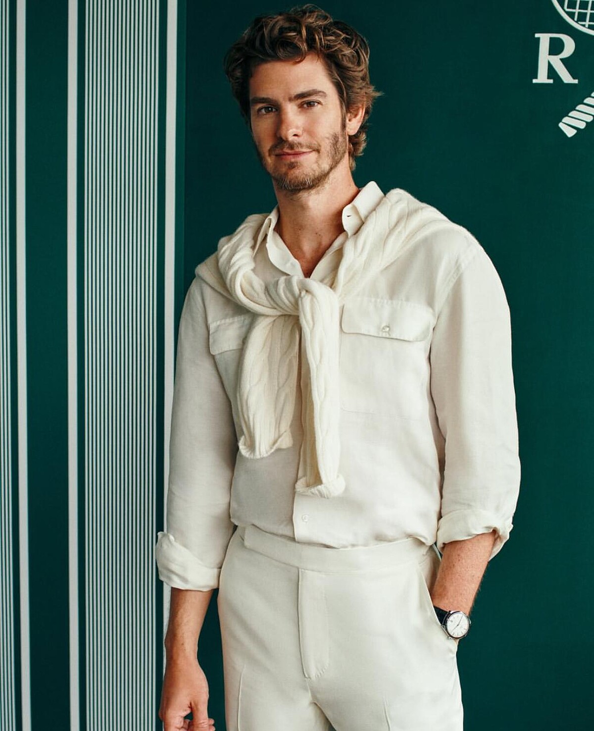 二代蜘蛛人Andrew Garfield與女友一起現身溫網,兩人都運用經典白色打理造型,Andrew Garfield鬆軟材質的襯衫外披上一件麻花針織衣,堪稱上流紳士的休閒穿搭範本。
