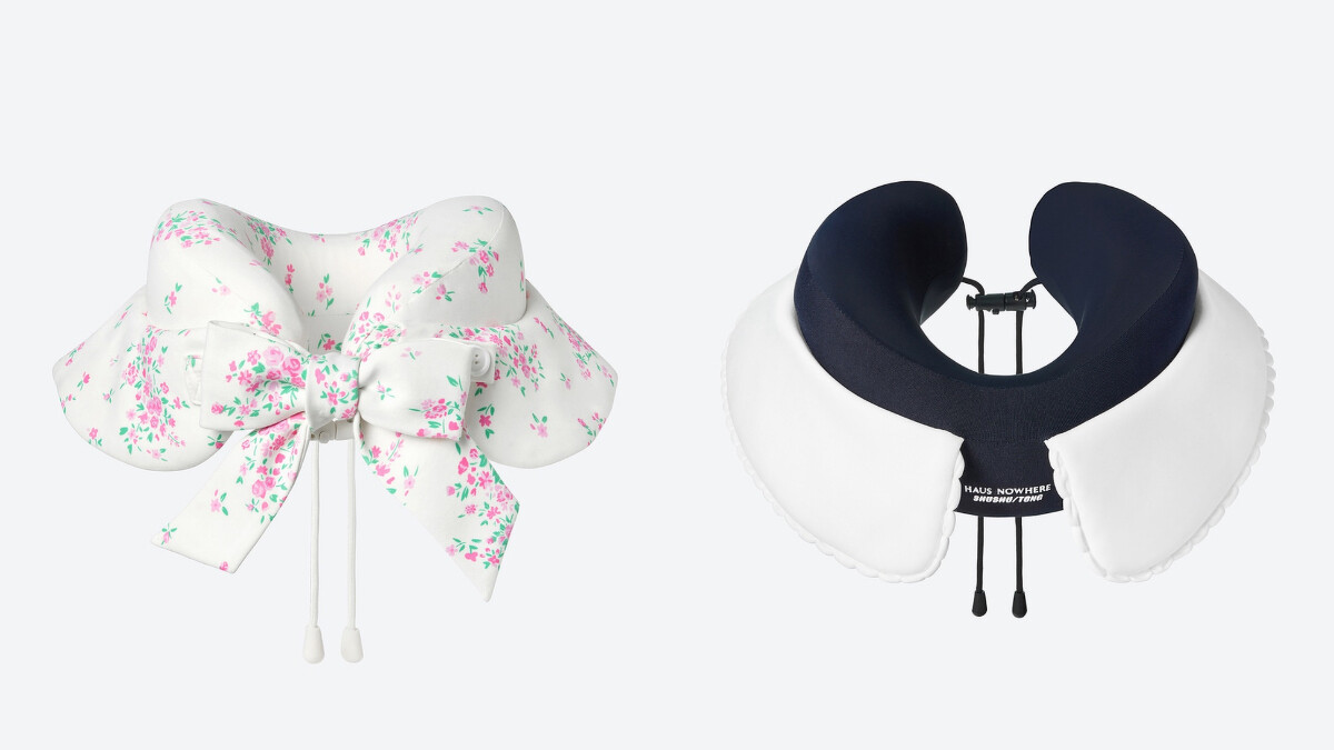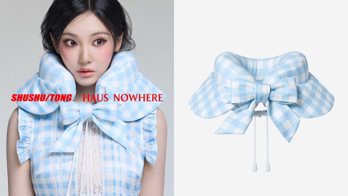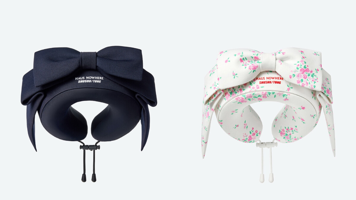 另一款頸枕在兩側延伸領片,並在前方打了個蝴蝶結,當你戴在脖子上時,就會像是個穿著端莊得體的小公主一樣。如果有了SHUSHU/TONG x Haus Nowhere的頸枕,肯定立刻下訂機票、戴上飛機炫耀,去哪裡都行吧!