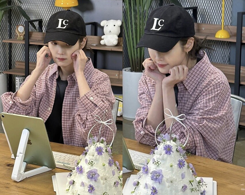 今年5月時,IU與官方粉絲俱樂部一起慶祝生日的直播中,戴著黑色棒球帽搭配一件紅色細格紋Oversized襯衫,寬鬆的輪廓因為細小的格紋設計顯得精緻許多。