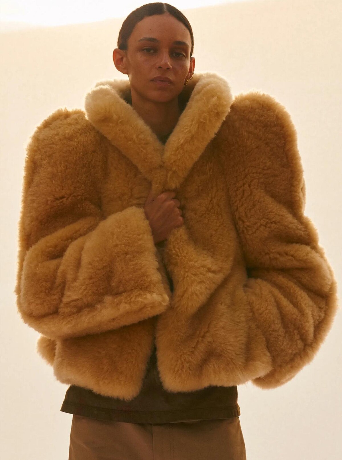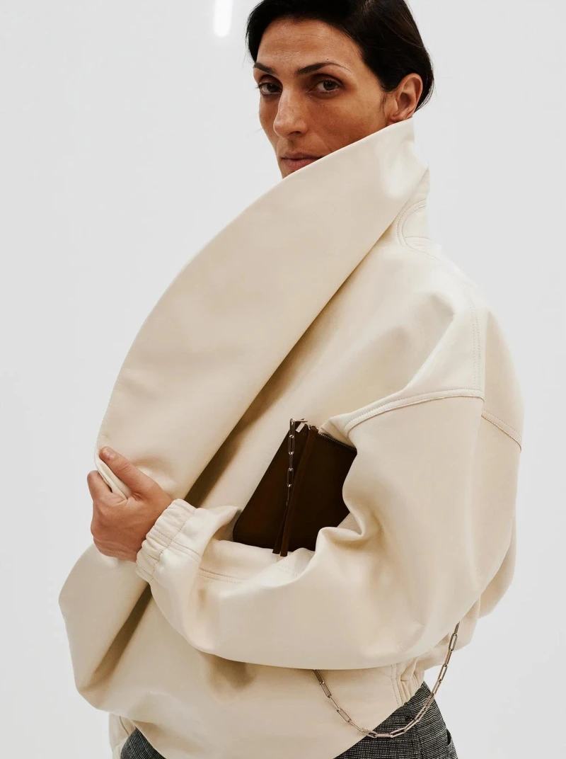 立領造型的各式皮革夾克、風衣,讓造型更具雕塑立體感,有點誇張、但很時髦!另外也能看見她將剪羊毛雲朵般的柔軟質感極度視覺化,化為巨大綿密的外套,讓穿著者直接陷入其中。更多的形象照下方帶你一次看!
