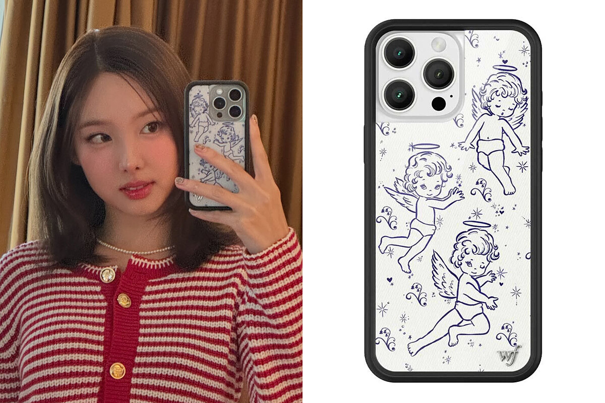 受到BLACKPINK、趙露思和TWICE等名人喜愛的美國手機殼品牌Wildflower Cases,靠著繽紛可愛的圖案設計成功打入千禧少女的市場,娜璉同款小天使 Cherubs系列以三個可愛的小天使在米色背景上飛舞為主題,點綴著午夜藍的閃亮星光、愛心和鈴蘭花,充滿少女心。
