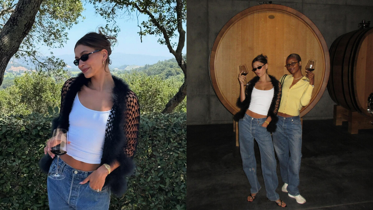 Hailey Bieber 就是這股風潮最會穿的一位代表。在他分享的貼文中曬出度假穿搭,選了一件黑色毛邊洞洞外套,搭配白色細肩背心與高腰牛仔褲,整體造型輕鬆又不失質感,若有似無的罩衫視覺效果,再配上一副小墨鏡與紅酒杯,隨著Justin Bieber 發布了新單曲,這套穿搭也輕鬆成為話題焦點!