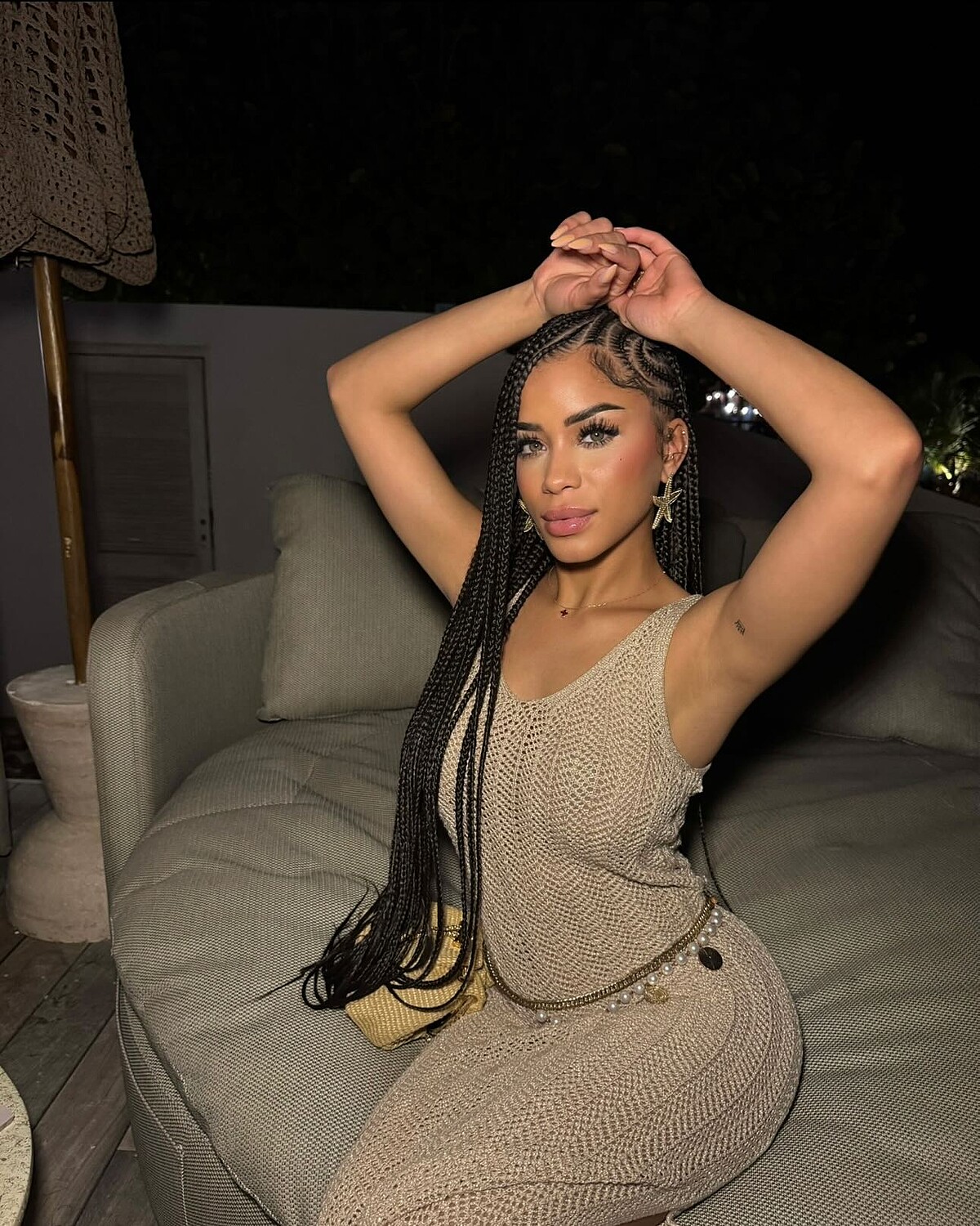 到夜晚,洞洞風還能繼續進化,連身洋裝結合鉤針元素,整體貼身卻不緊繃,像米色這種低調色系,反而讓洞洞的紋理更清晰、更有立體感,加上腰間金鍊、誇張耳飾,視覺直接升級,完全能從泳池畔一路美到夜晚聚會。