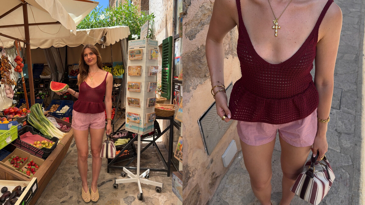 如果你喜歡夏季感更強一點的路線,洞洞小背心或許就是今夏最值得入手的單品。像是酒紅色鉤針背心搭配粉色短褲,簡單套上草編鞋、再提個托特包,走在歐洲市集、或是台南老街都毫無違和感,鏤空的編織圖案不只帶著輕盈元素,還讓整體看起來更有層次。這種穿法不會過度性感,每一個細節都剛剛好。