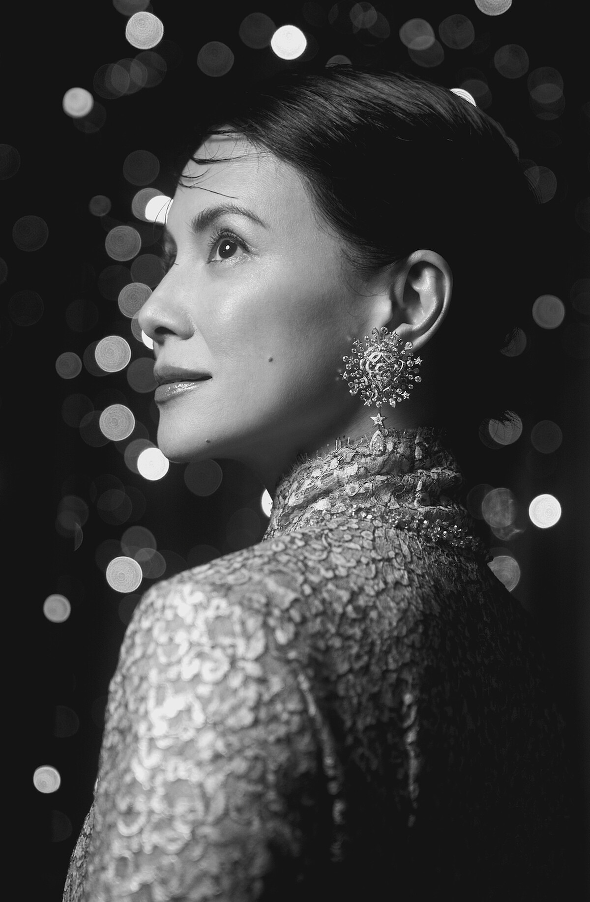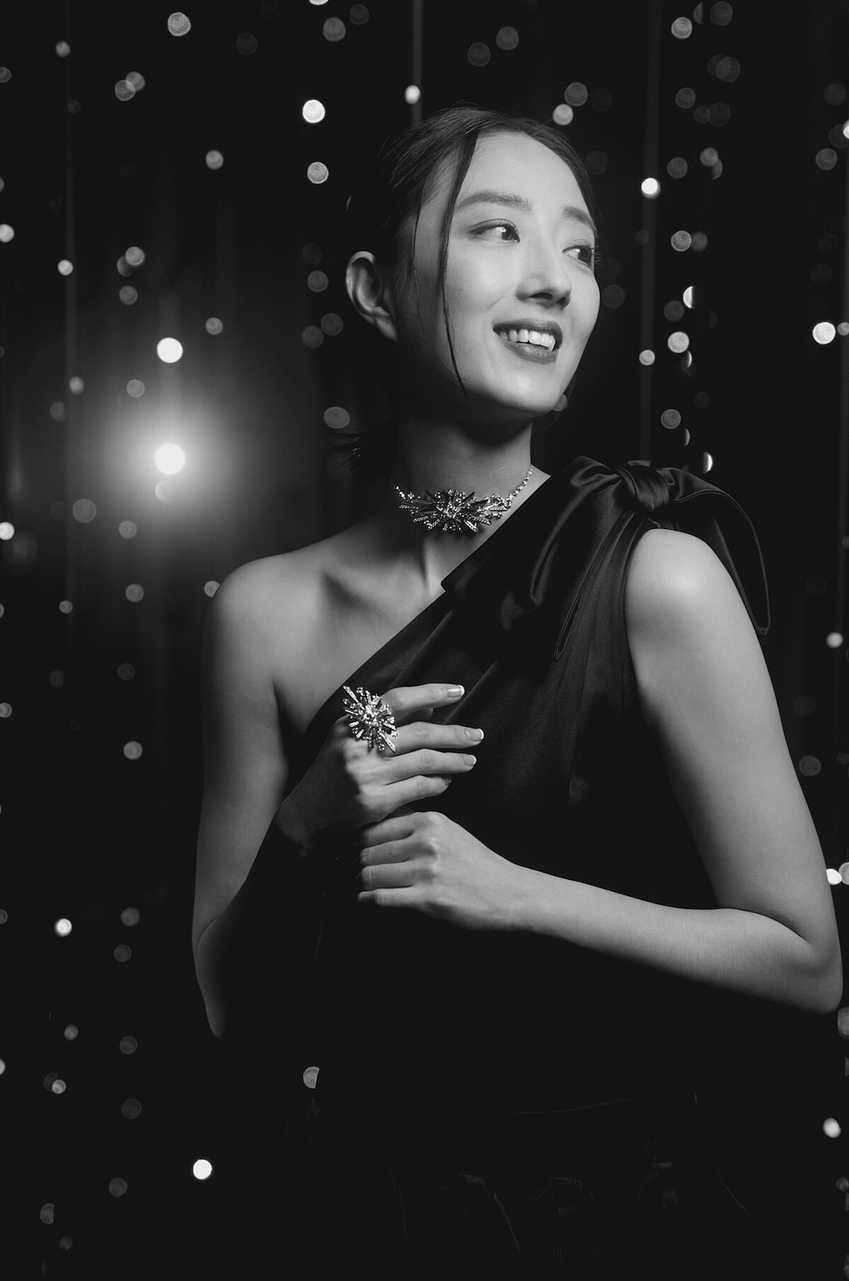 桂綸鎂選穿香奈兒 2025/26 秋冬高級時裝系列,黑色綴以蝴蝶結緞面長洋裝,搭配Chanel全新頂級珠寶「Reach For The Stars」系列的頸鏈、戒指,優雅之中不失時髦態度。項鍊為首度現蹤於頂級珠寶的頸鍊式作品,更顯其獨特性。