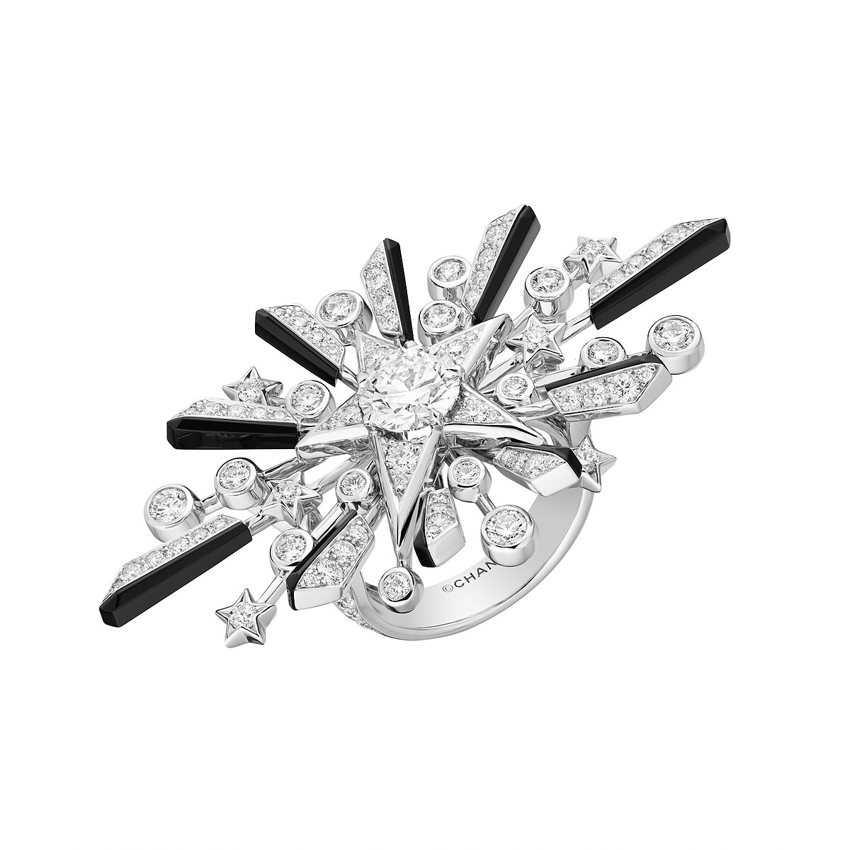 Dazzling Stars 戒指:18K白金,鑲嵌天然鑽石並飾以黑漆。1 顆重約 1.54 克拉 D-E-F IFVVS 明亮式切割鑽石。