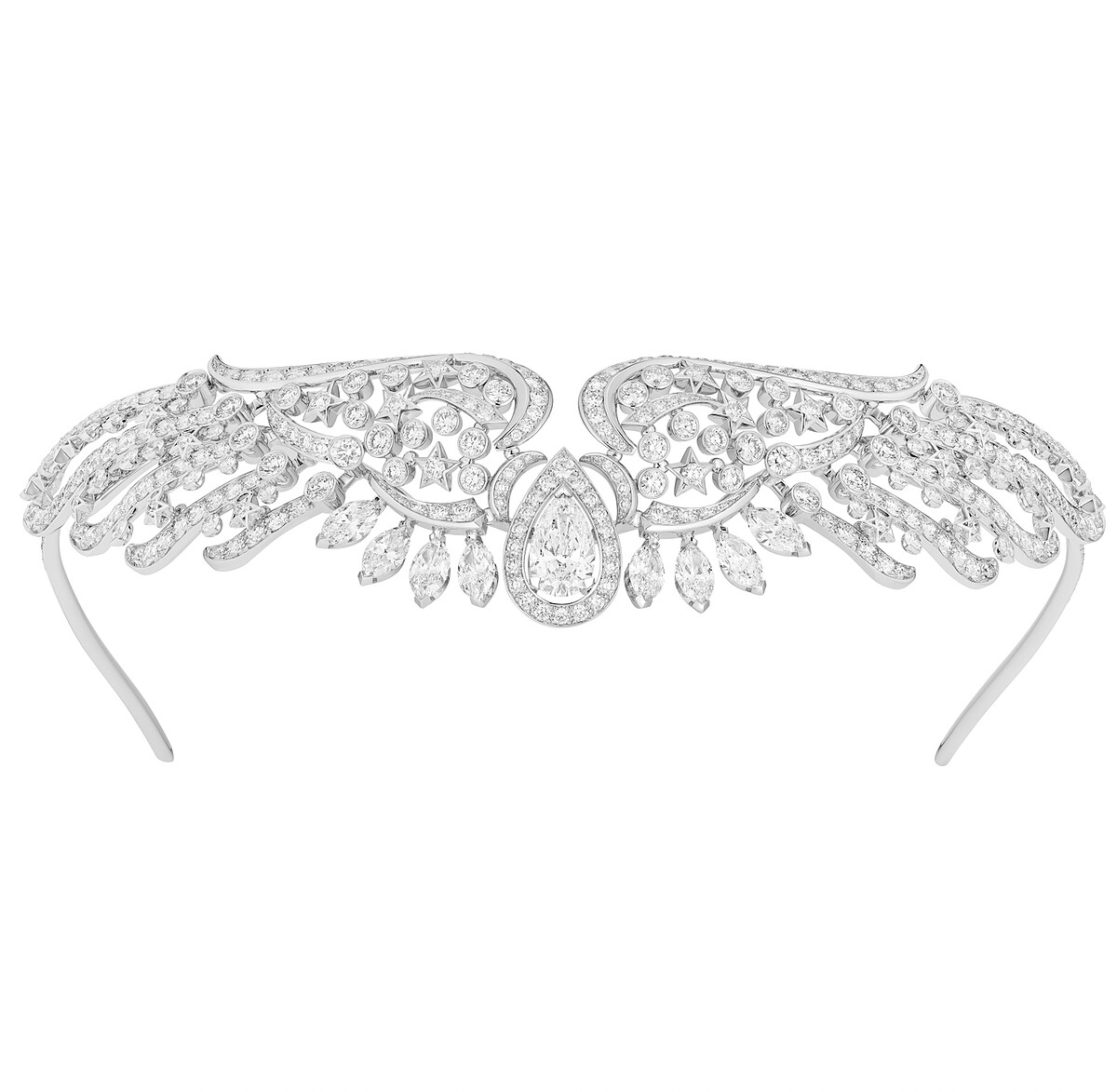 此為系列中唯一的頭飾。其特色為鏤空白金翅膀鑲嵌明亮式和馬眼形切割鑽石交織成如蕾絲般效果。 碩大中鑲主石因周圍鑽石鑲嵌及梨形切割鑽石,兩個翅膀之間的留白,更顯璀璨。而飛羽及中鑲主石設計皆具柔韌性以適應所有頭部形狀。建議將此作品配戴在髮際線水平處,作品兩端可繫上絲帶,以便輕鬆固定於頭部。 製作工時:638 小時。