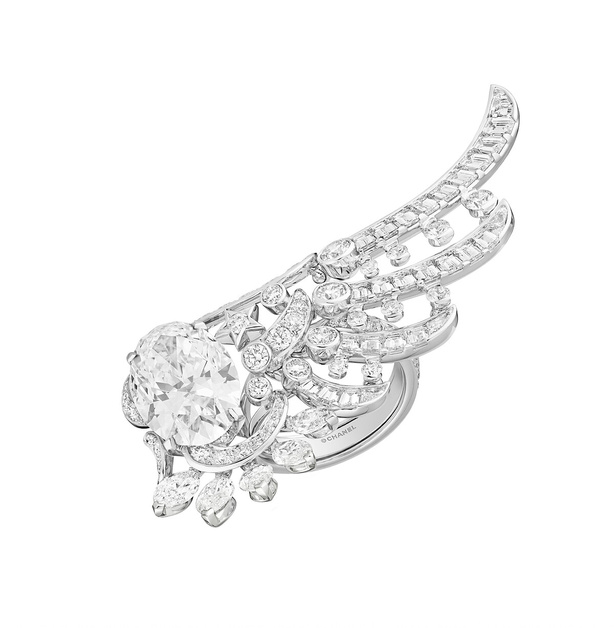 Wings of CHANEL 戒指:18K白金,鑲嵌天然鑽石。1 顆重約 8.15 克拉 DFL橢圓形切割鑽石。