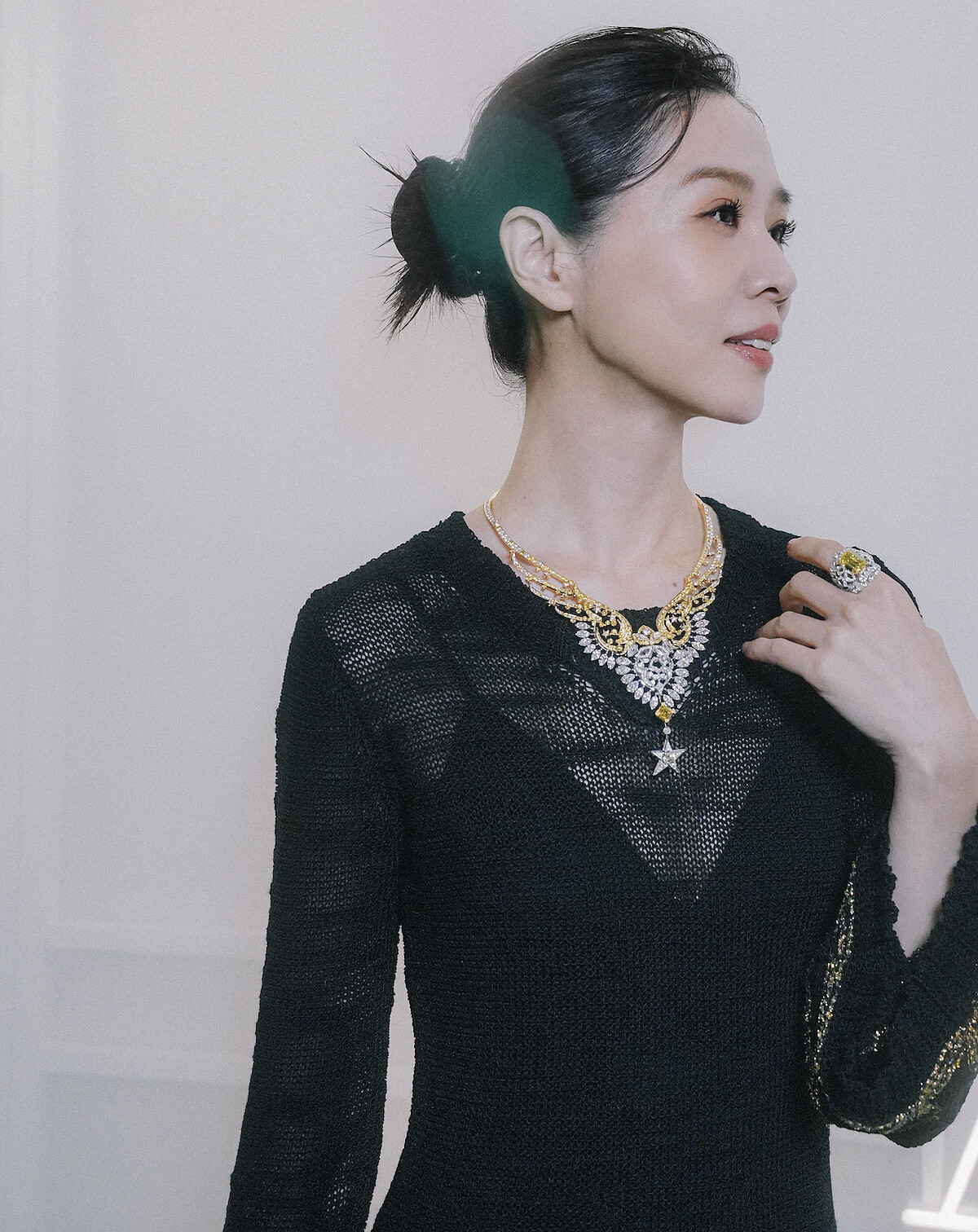 謝盈萱選穿香奈兒 2024/25 Métiers d’art 工坊系列,飾有金色刺繡之黑色羊毛長版洋裝,搭配成套之Sky Is the Limit 項鍊:18K白金及黃金,鉑金,鑲嵌天然鑽石及天然黃鑽。1 顆重約 3.01 克拉 FVY 正方祖母綠形切割 (asscher-cut) 黃鑽。以及Sky Is the Limit 戒指:18K白金及黃金,鑲嵌天然鑽石及天然黃鑽。1 顆重約 11.11 克拉 FVY 祖母綠形切割黃鑽。