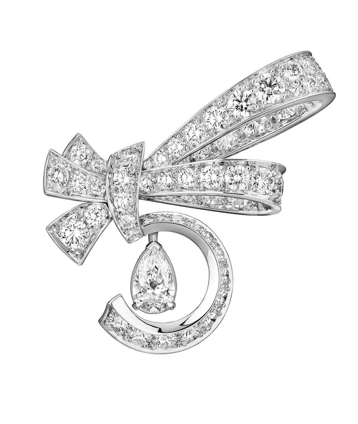 Full Swing 頭飾:18K 白金,鑲嵌天然鑽石。 1 顆重約 3.08 克拉 D-E IF-VVS 梨形切割鑽石。 所標示的克拉數及材質僅作為參考,價值不具有約束力。 建議售價NTD 49,883,000 元