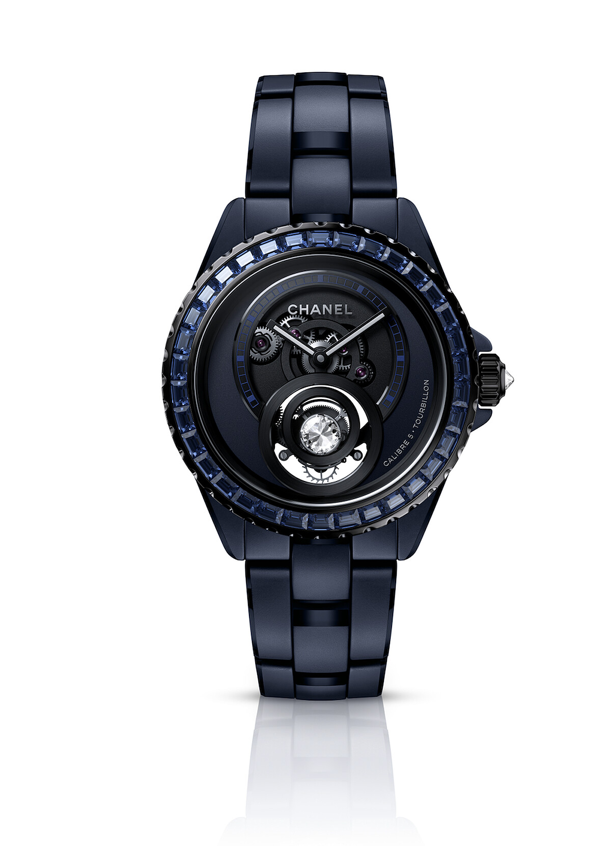 J12 Blue 鑽石陀飛輪腕錶限量發行55枚/直徑38毫米霧面藍色高抗磨陶瓷和黑色塗層精鋼錶殼/藍寶石水晶玻璃底蓋鐫刻「LIMITED TO 55」字樣/黑色塗層精鋼固定式錶圈,鑲嵌34顆總重約4克拉長階梯形切割藍色藍寶石/藍色鏤空錶盤/陀飛輪框架鑲嵌1顆重約0.18克拉 - F/G - VVS獨特切割單鑽/非旋入式黑色塗層精鋼錶冠,鑲嵌1顆重約0.16克拉明亮式切割鑽石/霧面藍色高抗磨陶瓷錶鍊,拋光倒角處理,飾以黑色塗層18K白金三層折疊式錶扣 /搭載CHANEL自製Caliber 5飛行陀飛輪手動上鍊機芯/動力儲存:約42小時 功能:時、分顯示/防水深度:50米