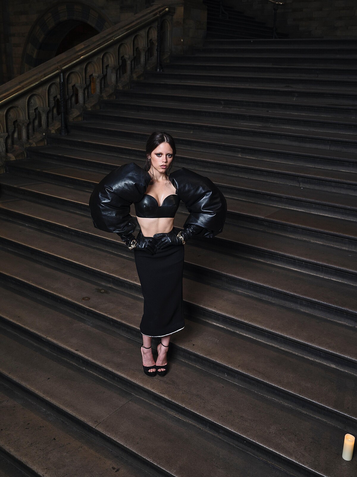 Jenna Ortega進行漂眉後,眼窩輪廓視覺上感覺更深邃,令眼神更加神秘,在Givenchy by Sarah Burton 2025秋冬系列的這件全黑造型裡,皮革胸衣、窄裙和巨澎的手袖,形成戲劇化的比例,看著像肌肉手臂一樣有些搞笑,不過Jenna Ortega的女王氣場駕馭起來,既冷豔又時髦。