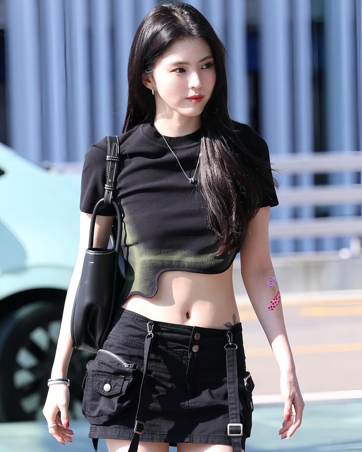 韓韶禧穿著紫色上衣搭配黑色鏤空蕾絲短裙,包款是 Charles & Keith Bryna 系列 皮帶釦肩背包,鞋款搭配 Robbie 丹寧方釦直筒靴,採用刷舊深灰丹寧材質,展現街頭風格,方頭粗跟設計兼顧穩定與舒適,為造型注入俐落時髦感,展現經典的酷女孩風格~