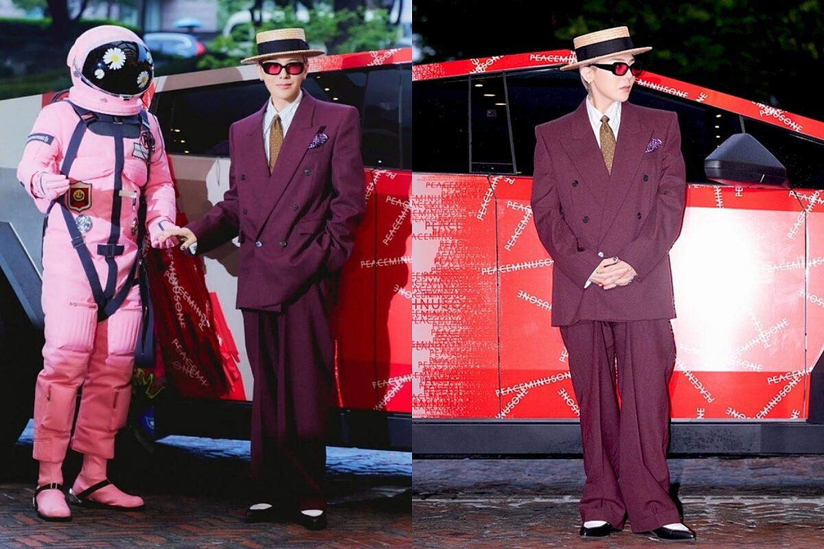 GD在今年6月時出席個人品牌PEACEMINUSONE調酒上市活動時以一身酒紅色西裝搭配紳士草帽的造型亮相,腳上搭配的就是Pennyplate為他特別訂製的尖頭黑白撞色樂福鞋,展現時髦雅痞的紳士造型。