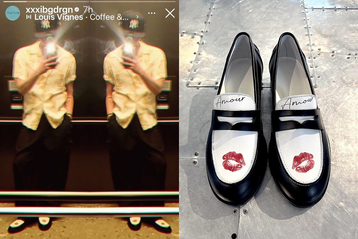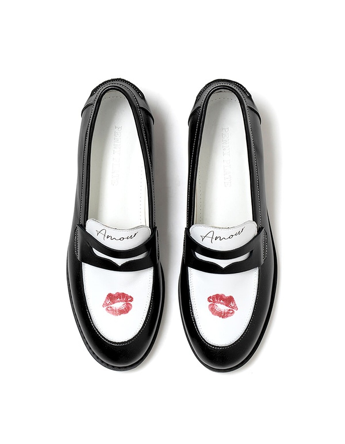 尖頭樂福鞋不是GD的第一雙Pennyplate,在過去分享的限時動態中,GD的私服造型也曾穿上過品牌的黑白撞色的唇印圖樣樂福鞋,這雙鞋也是Pennyplate最標誌性的「Kiss」鞋款。