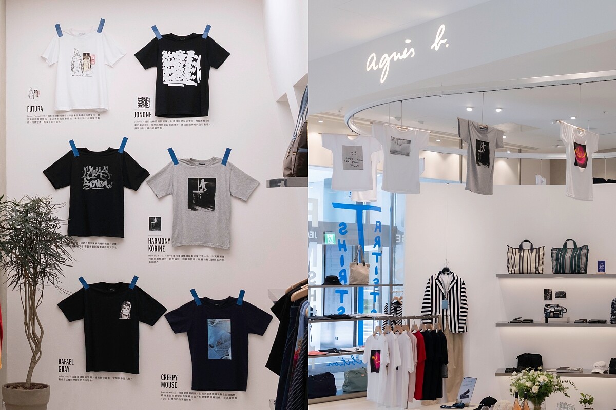 經典的法式品牌 agnès b.今年適逢迎接品牌50週年,在 DREAM PLAZA 打造品牌全新風格的概念店,並同步推出《Artist Tee Exhibition》,將經典的藝術家 T 恤系列化為小型展覽,包括街頭藝術傳奇 Futura 2000、紐約塗鴉藝術家 JonOne,以及台灣首位合作藝術家 Creepy Mouse 共 17 位來自全球的藝術家作品在店內展示,展期至 9 月 28 日。