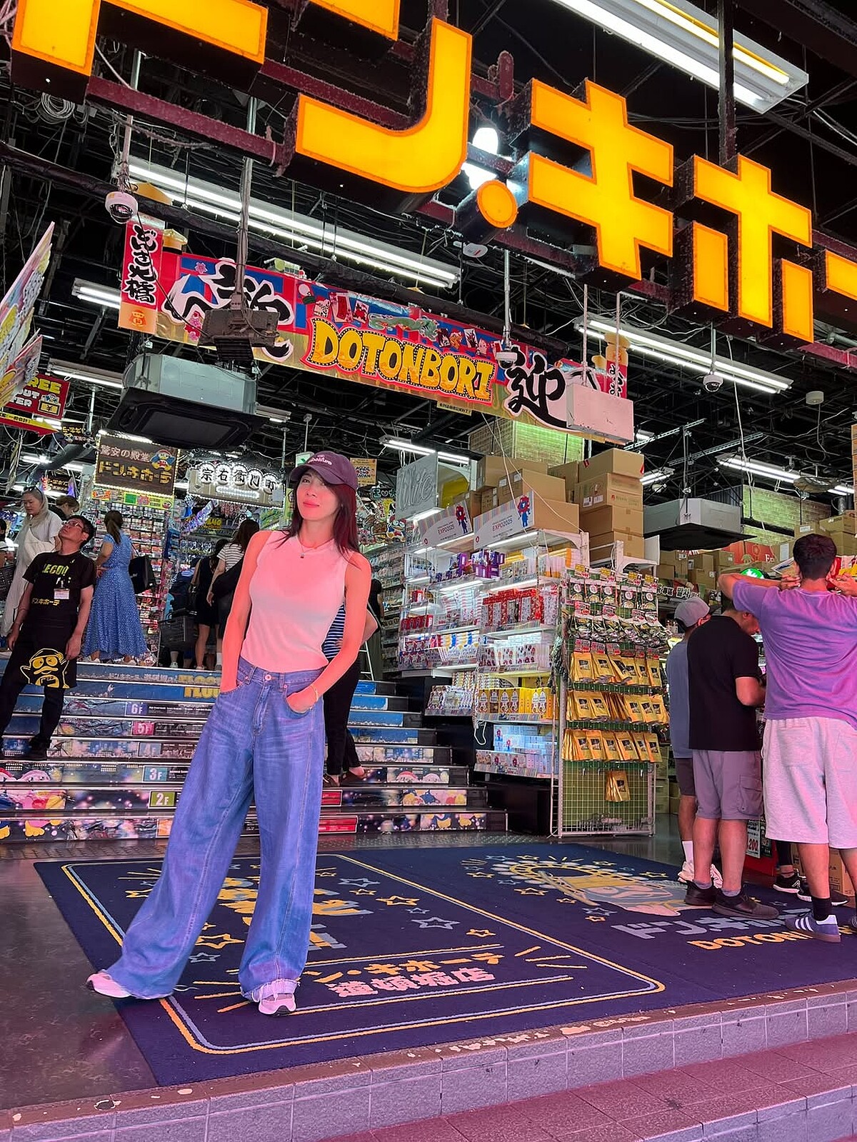 「白背心+牛仔褲」早已是河智苑的日常穿搭聖旨,她在旅遊時也運用坦克背心、寬牛仔褲,搭配棒球帽與球鞋,打造舒適靈活的Look,比起廣告中的造型,顯得更率性一些。