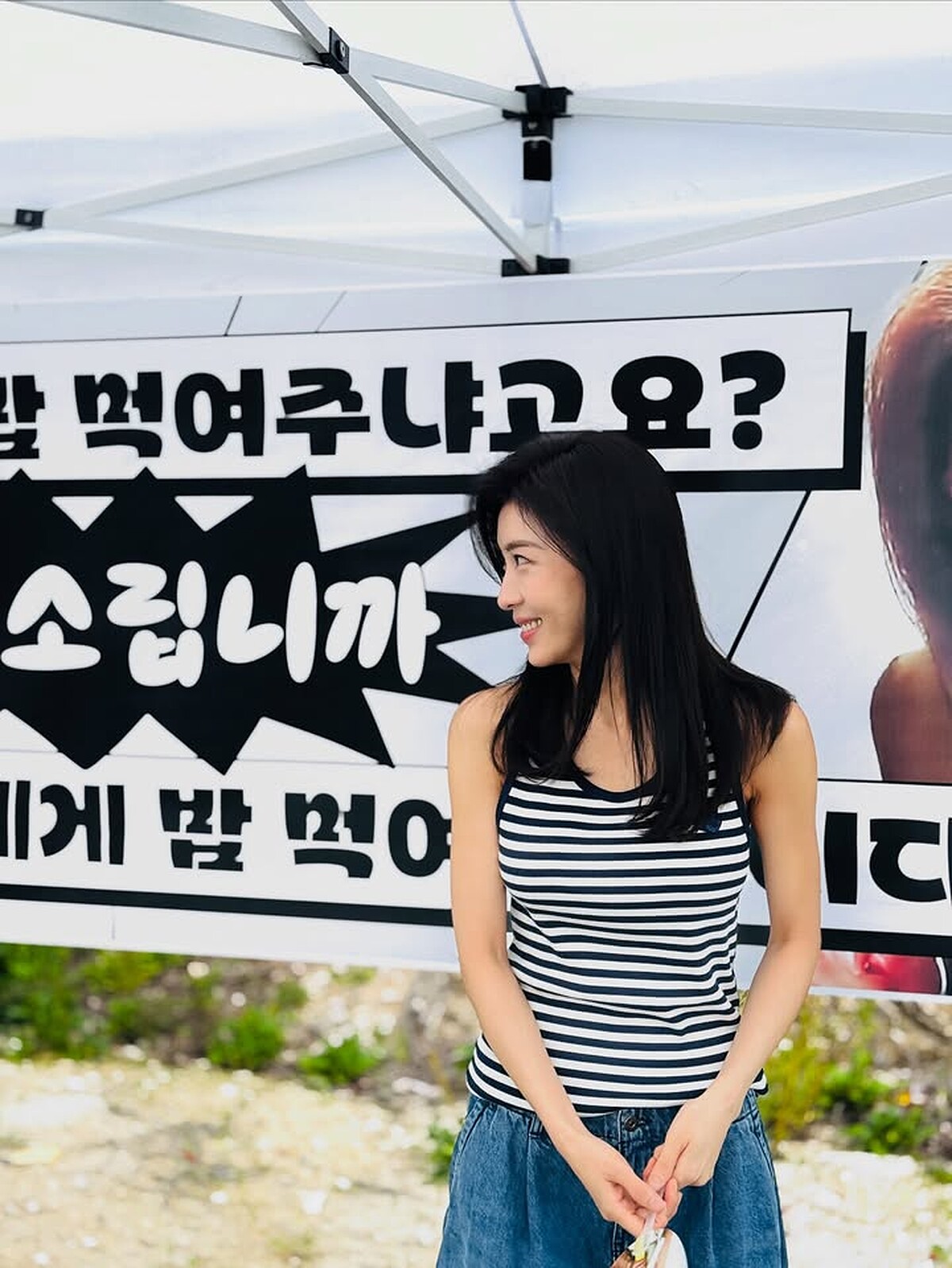 通常都穿素色T恤、背心的河智苑,有時會選擇條紋上衣來做點變化,而她的穿搭公式也依舊簡單,與衣櫃裡一定有的丹寧褲、寬褲……隨心組合,就是一個絕不出錯的搭配。