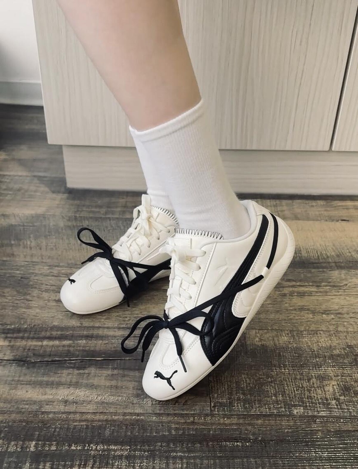 Rosé的聯名系列以Speedcat鞋型作為基調,延伸出了一款雙鞋帶球鞋,以及一款芭蕾舞鞋。外觀上與基本款Speedcat沒有顯著不同,不過Rosé的用心藏在細節裡,她選擇了全皮革的材質包覆鞋面,並在鞋側、鞋後跟設置了帶孔,讓鞋帶可以繞過,設計成了「雙鞋帶」的樣式,另外則可以在鞋舌、鞋帶上發現聯名小細節,總共帶來黑、白兩種配色。