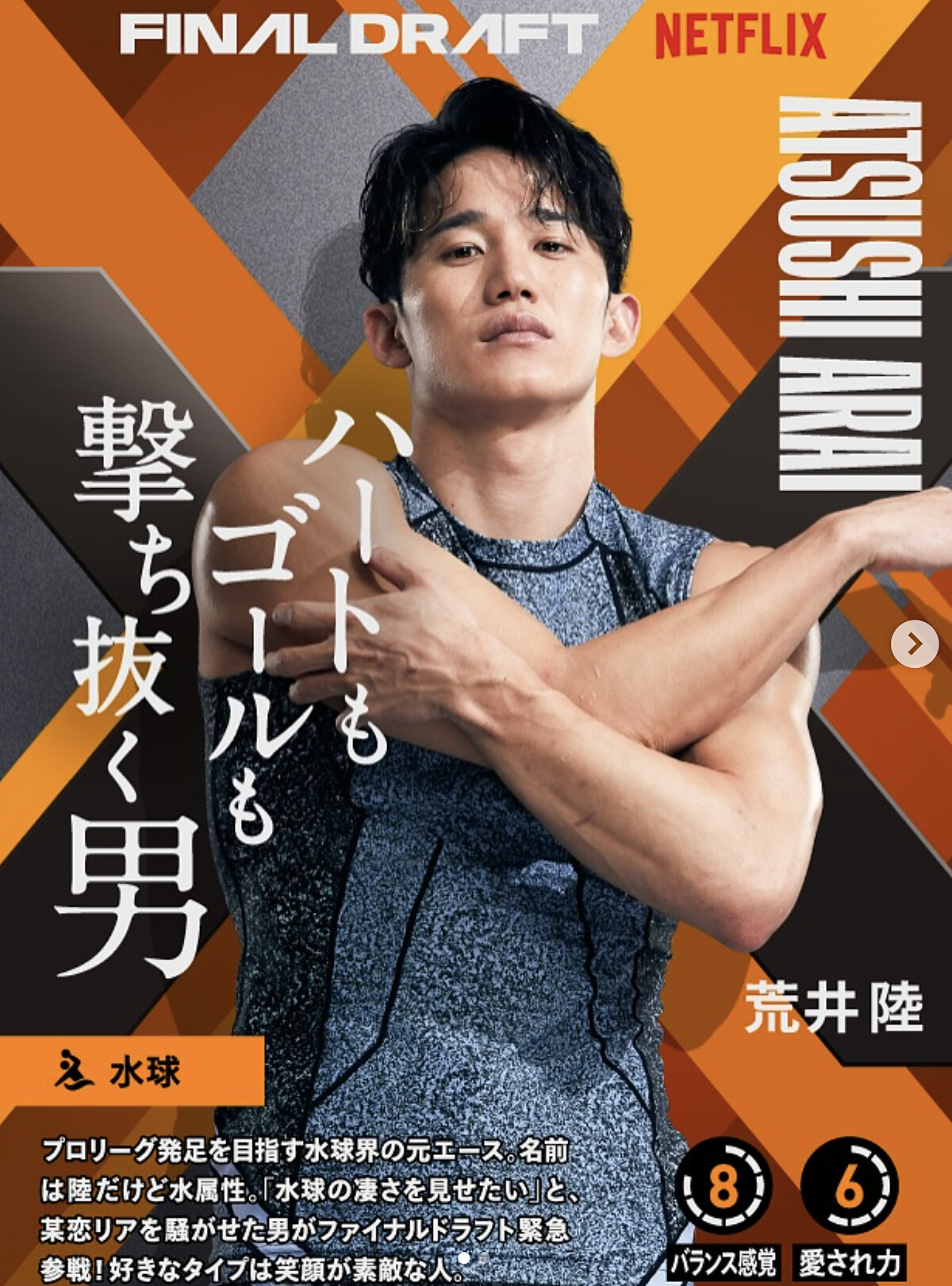 作為前日本國家水球隊一員,他曾出戰多次國際級運動賽事,並拿下亮眼成績。退役後,他轉而透過社群與觀眾互動,將運動員的專注與生活化的日常結合,讓粉絲得以看見一個更真實、親近的荒井陸。現在就讓我們看看水球男神私底下帥氣無距離的模樣。
