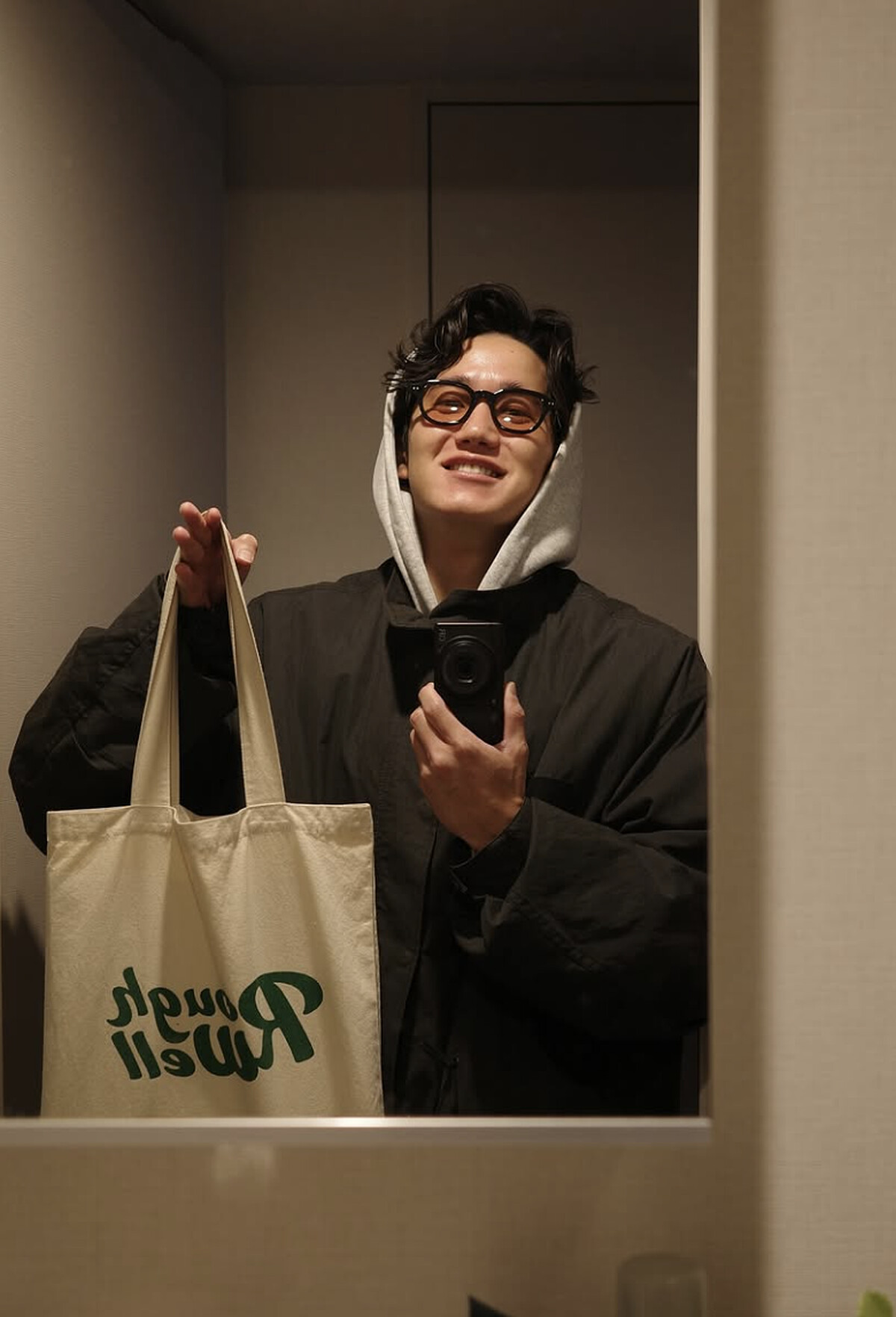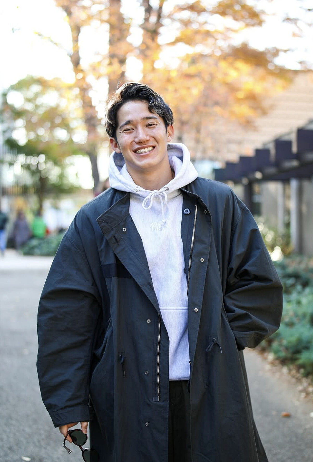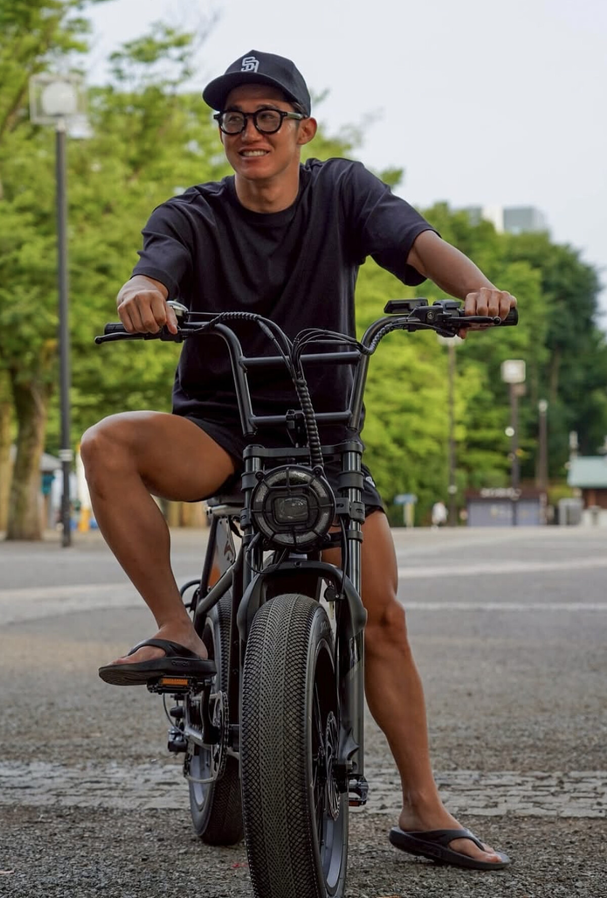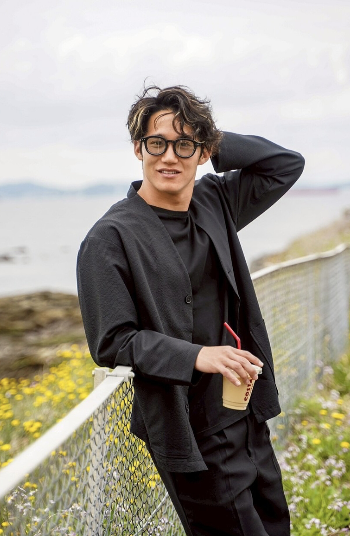 黑色寬鬆上衣與運動短褲組合,配合運動眼鏡或個性配件,荒井陸巧妙讓造型兼顧機能與個人特色。