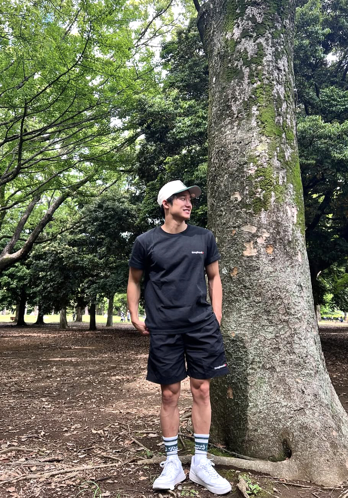 黑色 T 恤與短褲的公園 Look,配合輕便球鞋與運動襪,舒適中保有清爽的活力感。