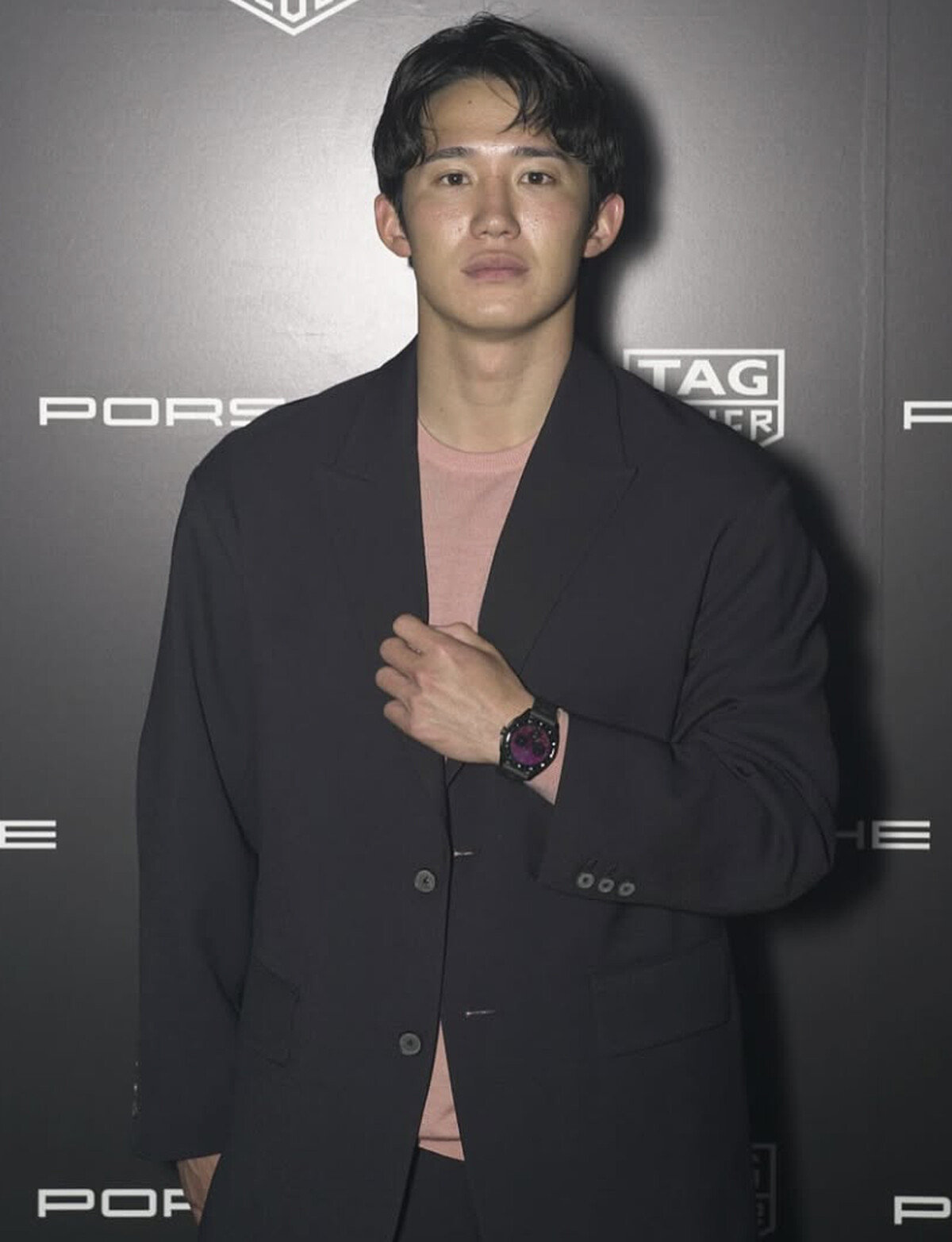 受矚目後,荒井陸也有陸續接受一些品牌的活動邀請,在一場品牌活動中,他選擇深黑西裝外套搭配粉色內搭,讓黑色的沉穩與粉色的柔和形成微妙對比,展現成熟又不失親和的氣質。