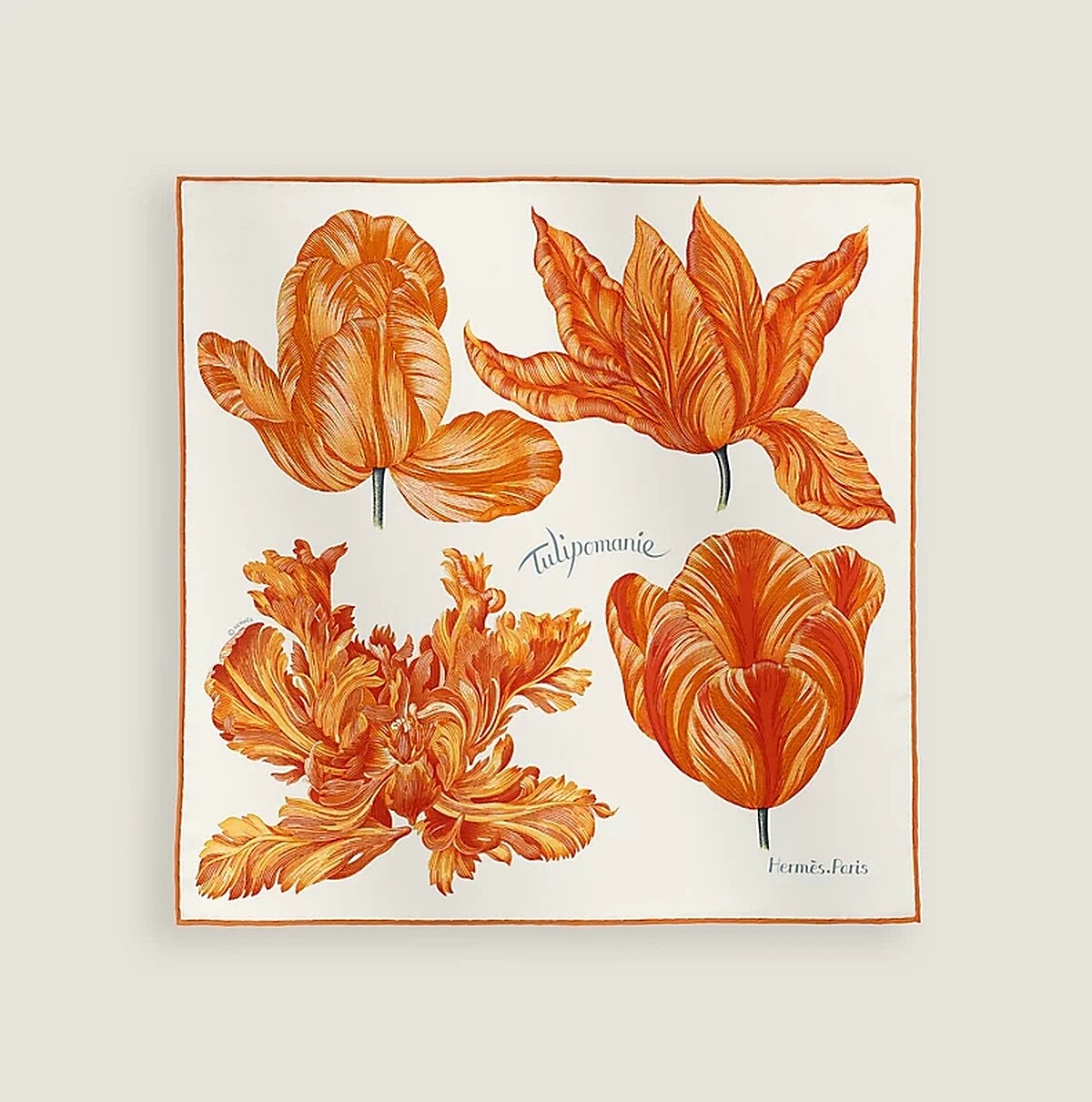愛馬仕橘為品牌標誌性的色調,在設計師Aline Honore的巧手下,橘色化為一片片鬱金香花瓣、以細緻筆觸呈現漸變色彩,白底搭配讓整體更實用百搭。