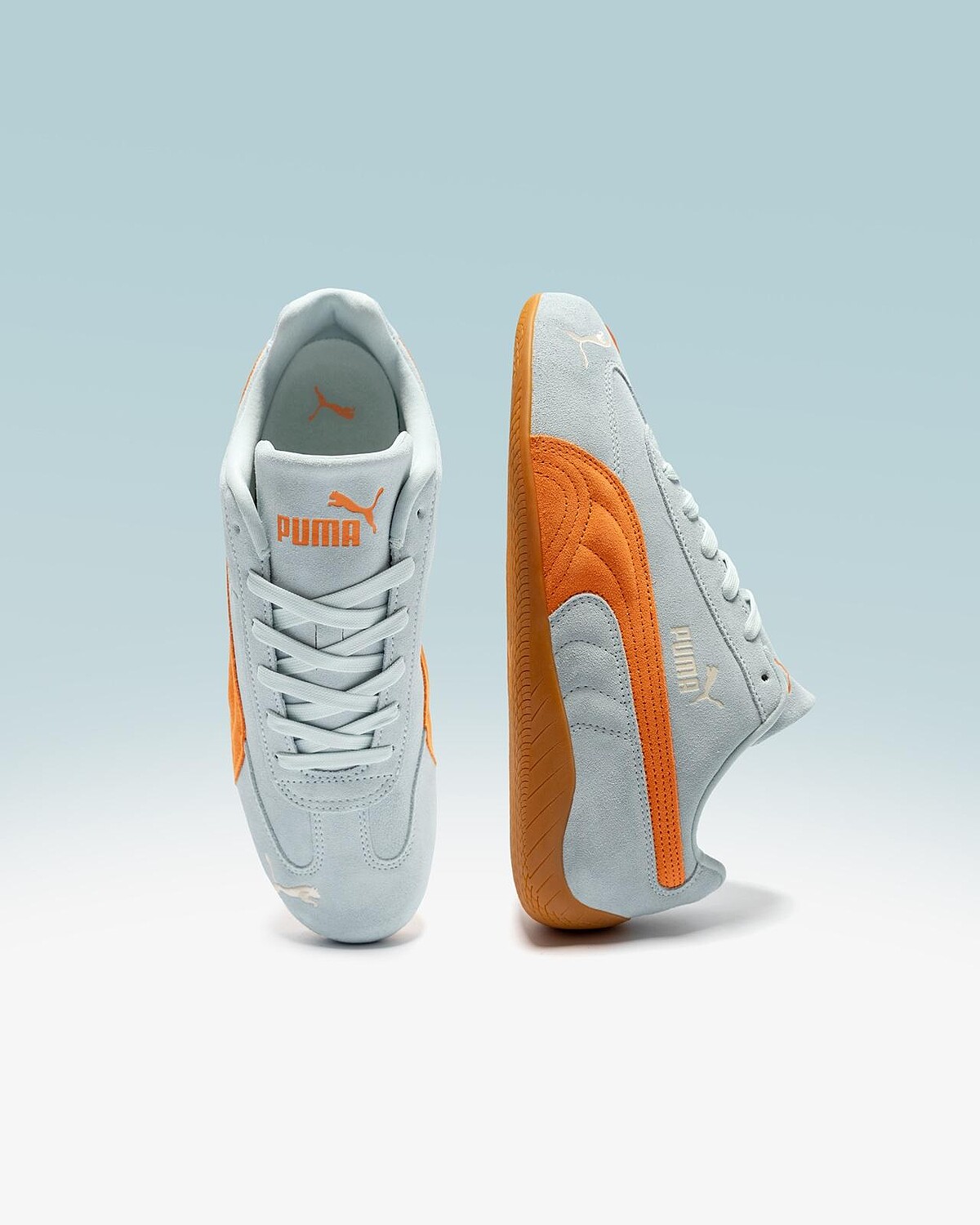 火紅全球的Puma Speedcat賽車鞋,今年夏天正是以「橘子汽水」為靈感,推出了全新夏日特調橘子汽水配色,鞋身採用淡雅的蘇打藍為基底,點綴鮮明的橘子果醬配色彎刀作為跑道細節,為穿搭閃耀著氣泡光澤。