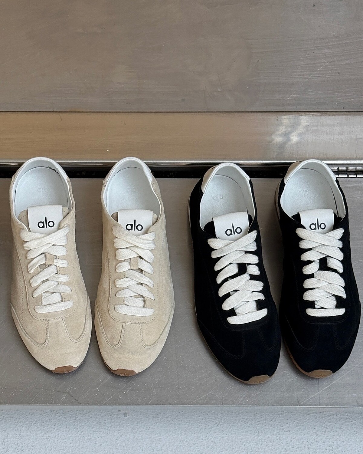 Sunset Sneaker以100%柔軟的絨面革製成,採用可塑性泡棉鞋墊,加入德訓鞋經典的縫線、輪廓,鞋側一條透氣孔低調點綴,並運用超寬鞋帶增加包覆度舒適性,也讓整體看來柔和無害,相較ALO其他機能跑鞋,Sunset Sneaker適用於皮拉提斯和輕鬆的日常場合,腳感非常的輕迎,不過尺寸偏小,如果你的尺寸剛好介於兩碼之間,建議訂購大半號。