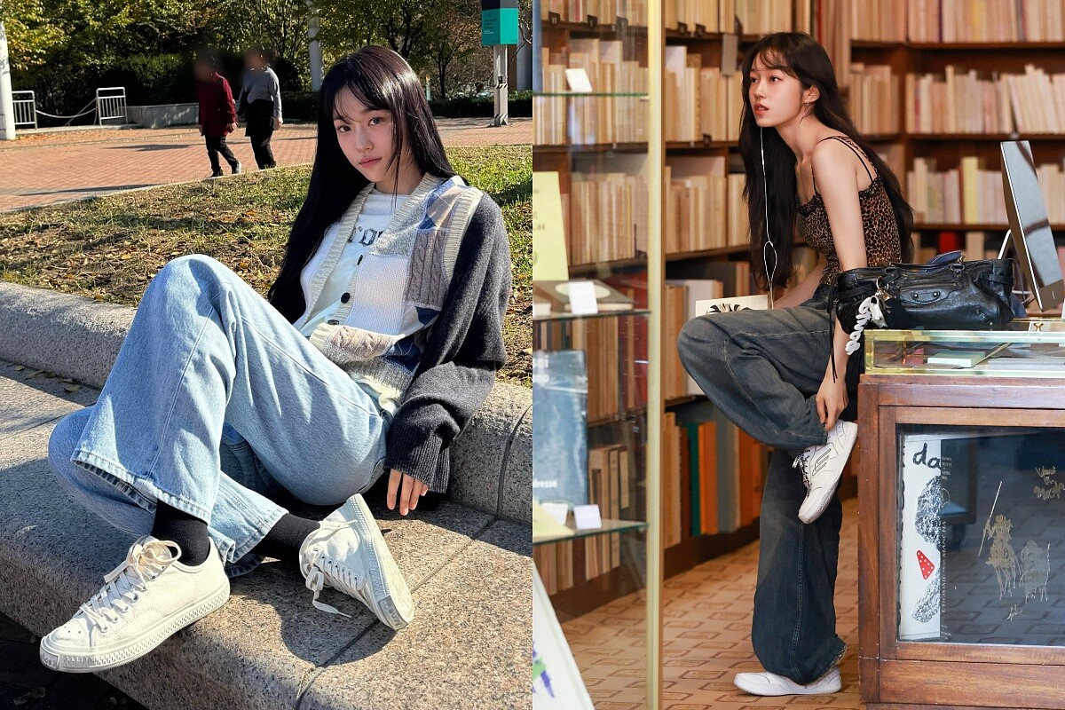 盧允瑞的「清新女友感」其中有一大部分來自於對牛仔褲的高頻率使用,像是在公園以白色T恤搭配灰黑色開襟外套,下身選擇淺藍牛仔寬褲與帆布鞋,散發自然、輕鬆的氛圍感;另一套則是豹紋吊帶上衣配上寬鬆水洗牛仔褲,腳踩同樣的帆布鞋,將性感與休閒完美融合,這兩種穿法看似日常卻細節滿滿,正是讓人覺得「隨性卻耐看」的女友風格穿搭。