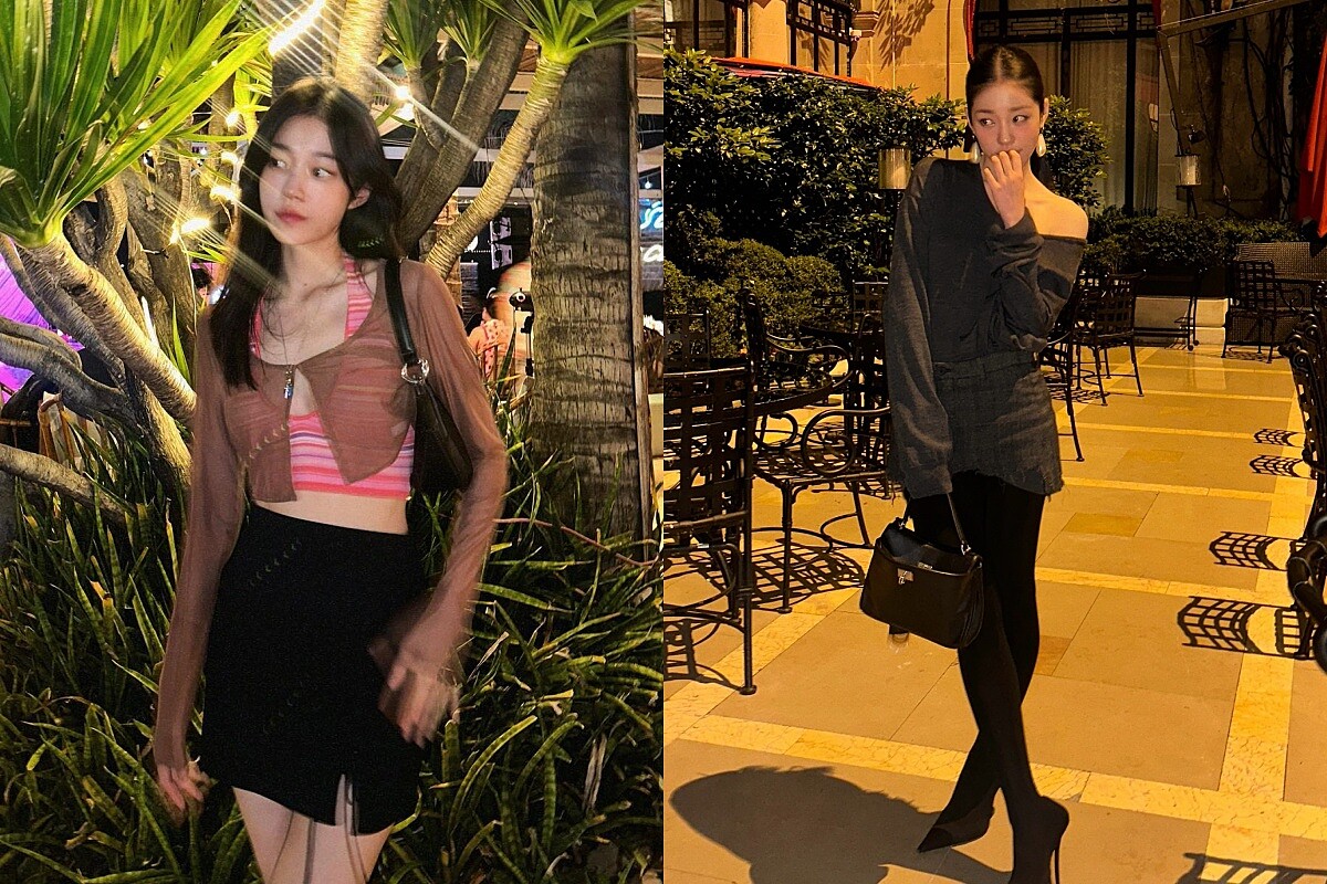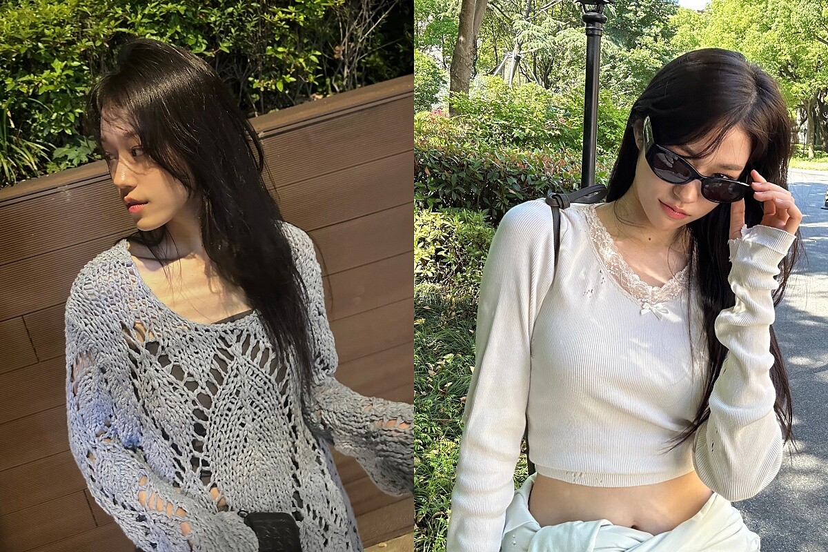 盧允瑞也常以針織單品營造慵懶氛圍,像是灰藍色鏤空針織衫內搭黑色背心,若隱若現的層次感讓隨性中帶點性感;另一套則是米白色針織上衣,以細膩的蕾絲領口點綴,搭配修長的袖口設計,柔美中多了一絲精緻,這兩種不同風格的針織穿搭,都呈現自在卻不失細節的氣質,像是午後散步或與好友聚會時最自然的樣貌。