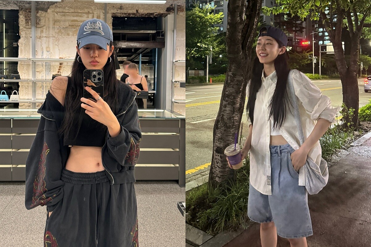 在休閒街頭感的演繹上,盧允瑞展現了自在的一面,像是黑色短版上衣搭配成套運動風外套與長褲,再加上棒球帽,率性中帶點帥氣,散發「酷感女友」氛圍,而另一套則是白襯衫配牛仔五分褲,依舊搭配同款棒球帽,簡單卻不單調,給人輕鬆隨和的親近感,這類穿搭就像是和男友一起散步、喝咖啡的日常,舒適卻能悄悄顯露時髦感。
