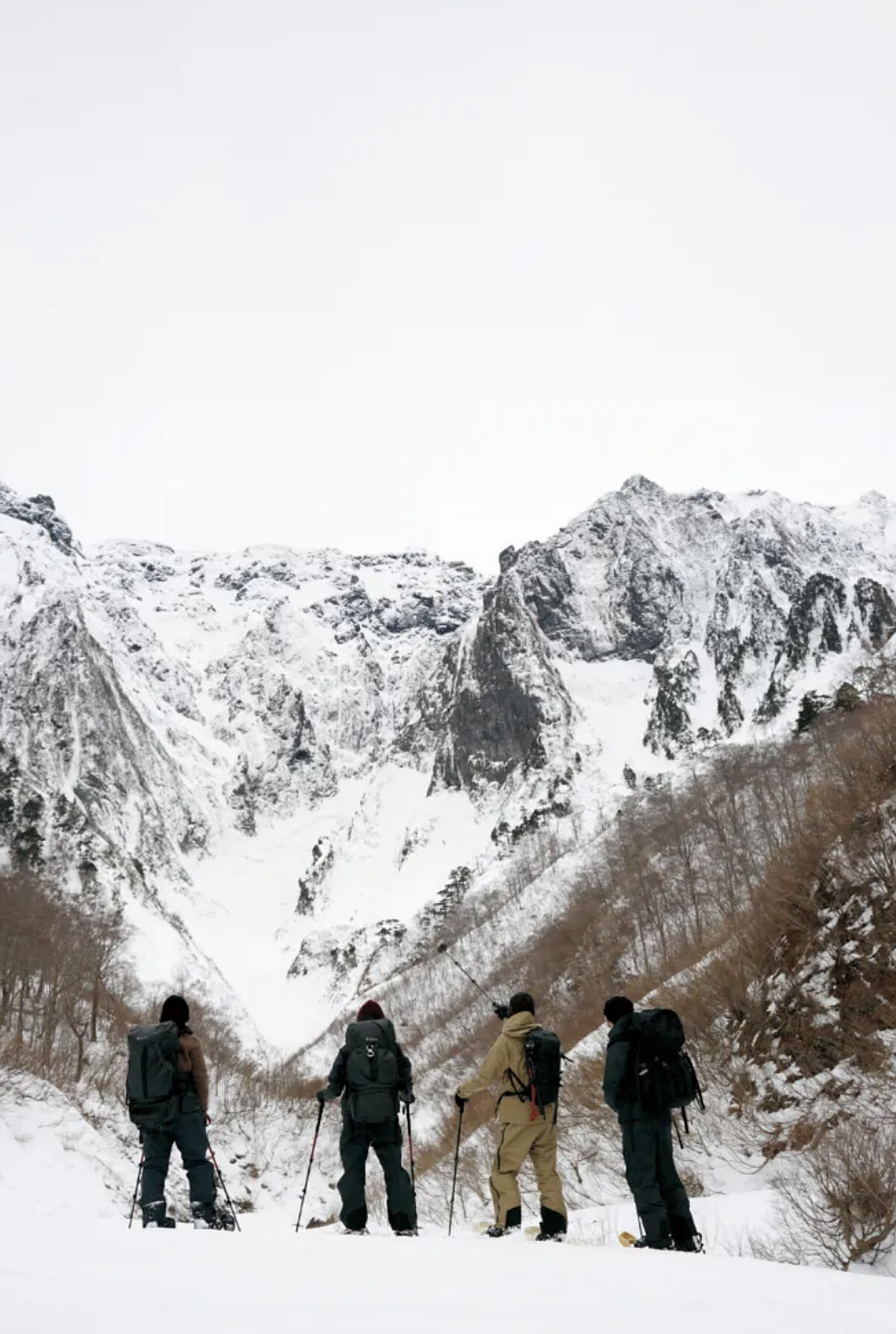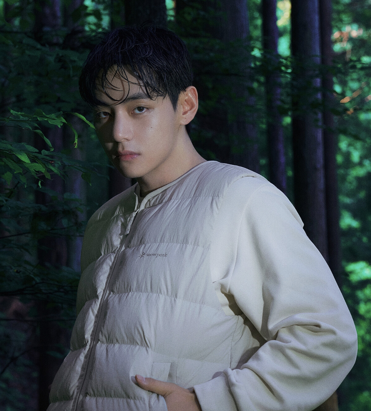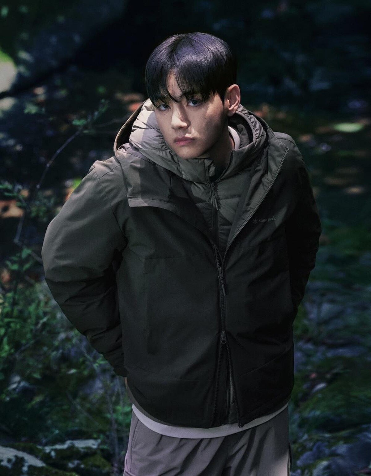 在拍攝中,V 置身於森林、樹木與自然光影之間,以冷冽卻溫柔的姿態演繹系列服裝。Snow Peak 表示:「V 完美詮釋了品牌追求的真摯戶外感性,他壓倒性的氣場、獨特的深邃眼神與感性風格,讓整個場景氛圍都被掌握。」
