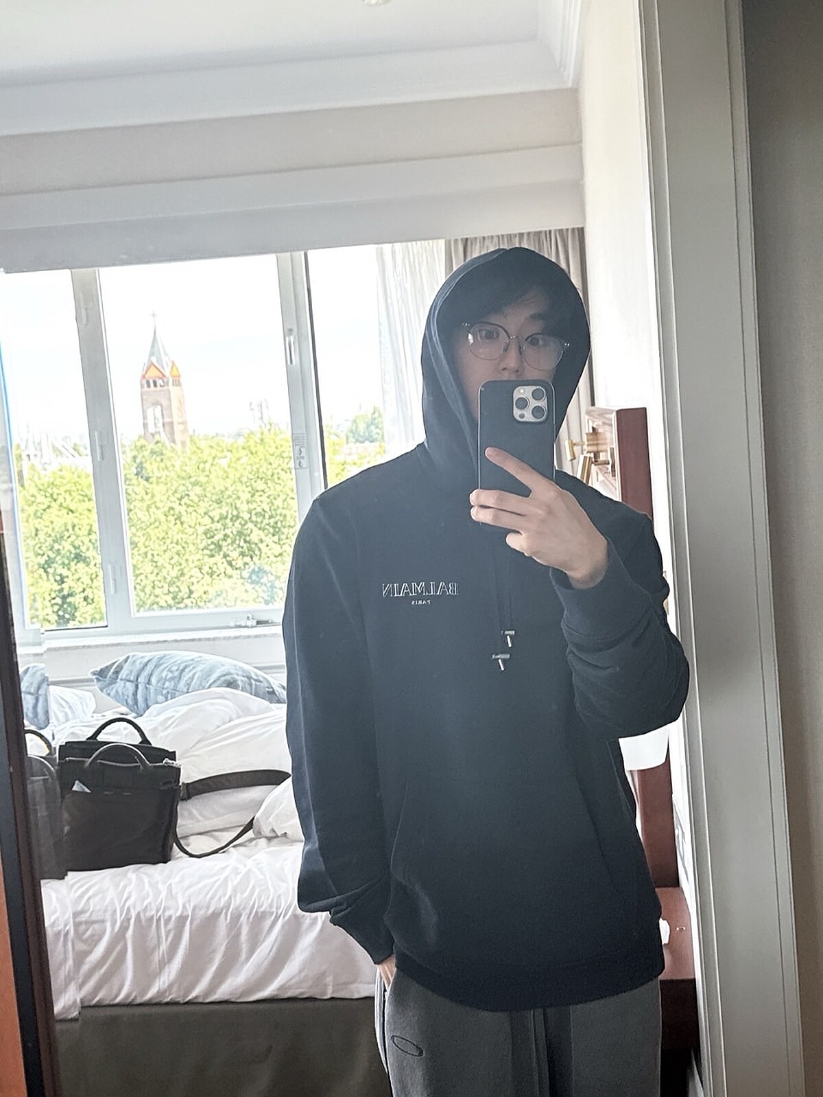 Stray Kids成員Han韓知城選擇BALMAIN 2025春夏系列連帽衛衣打造隨興又帥氣的私服造型,微落肩的設計也帶來屬於他的高級街頭風貌。
