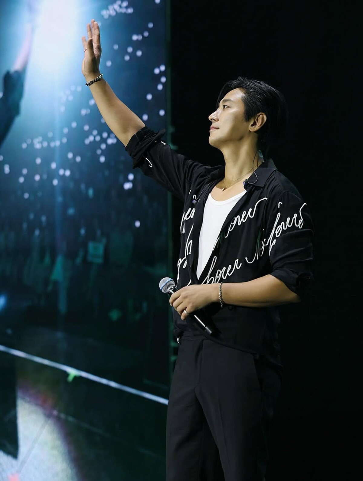 朱智勛也穿著同款字樣襯衫出席活動,將襯衫釦子打開內搭白色上衣,除了讓整體更具層次也展現屬於他的男人魅力!
