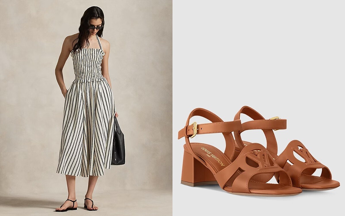 Ralph Lauren條紋洋裝:直達官網、Louis Vuitton LV Isola涼鞋:直達官網