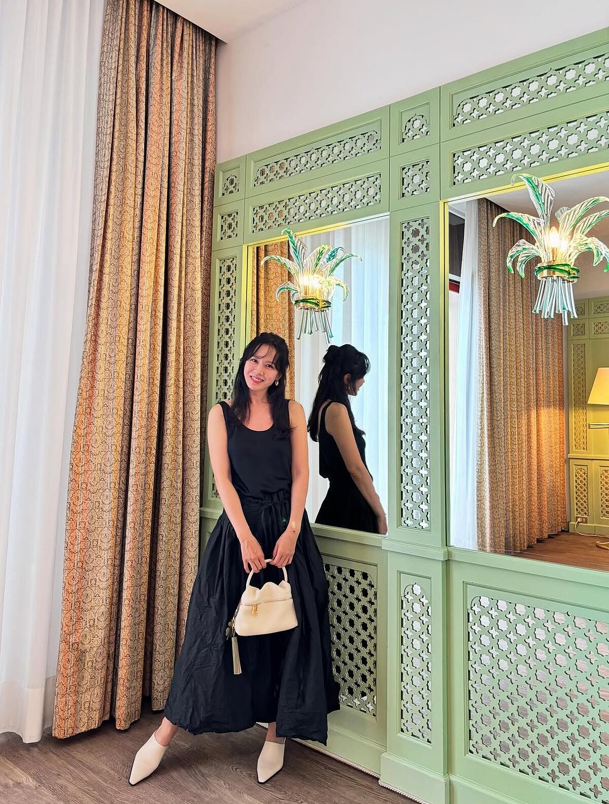 在踏上紅毯前,孫藝珍零時差在社群分享她的威尼斯造型,她以剪裁簡約休閒的連身裙,搭配了白色系的手袋和尖頭穆勒跟鞋,放鬆的笑容看得出心情、氣色都非常好,隨心紮起的公主頭則更顯從容優雅,同時透過鞋包,盡責帶貨她最新代言的義大利時尚品牌Testoni。