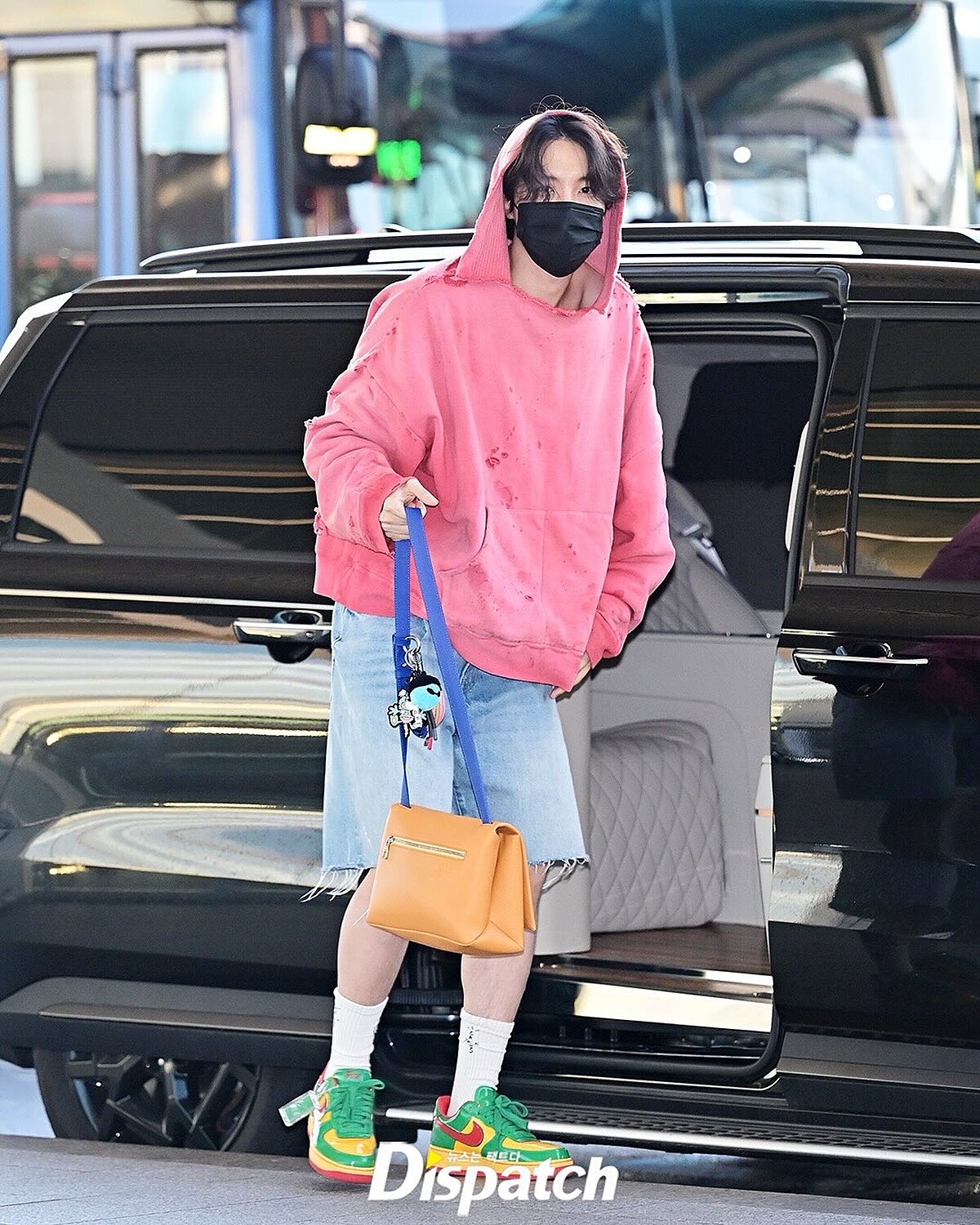 私下的 J-Hope 也很喜歡穿著粉色,他穿上 READYMADE 粉色帽踢,外加 Louis Vuitton 甜甜圈包吊飾,讓整體造型多了份可愛與童趣,這樣的搭配,不僅凸顯他陽光性格,也展現了街頭單品與高奢配件的反差魅力~