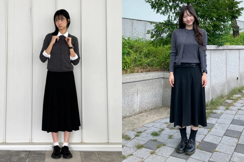 不少韓國女生都會搭配上針織衫或是襯衫造型,打造類似Geek Chic的時髦學院感,這樣的搭配法對於百褶裙入門的穿搭很友好,也很容易上手!
