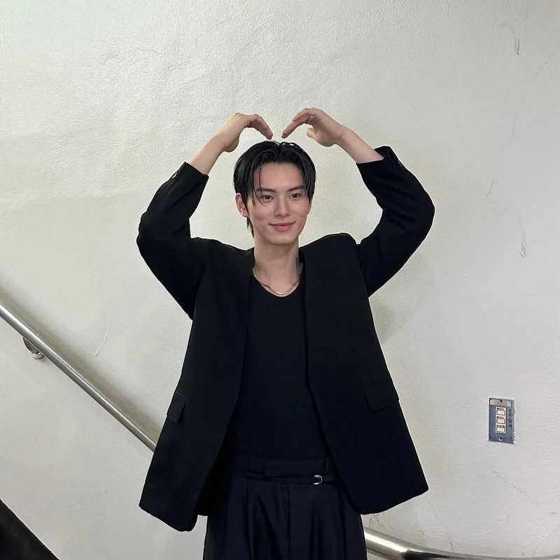 穿著黑色圓領T時,他搭配無領片的改良式西裝外套,稍微Oversized的設計強調出寬肩比例,搭配西裝寬褲充滿極簡時髦感。因為全黑配色,低領的地方可能顯得太空,他用一條銀項鍊就為自己增添一分酷帥的視覺亮點。