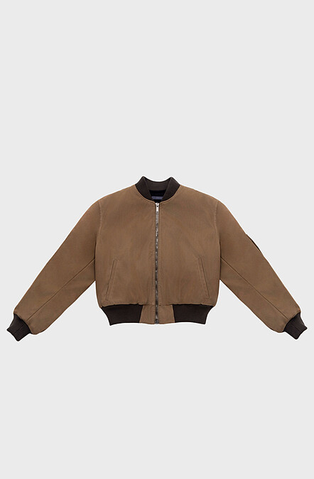 產品細節:厚重帆布泡泡袖飛行員夾克寬鬆版型,前拉鍊開合,前貼邊口袋、羅紋領口、袖口和下擺,全襯有填充物、內側有2個嵌線口袋。