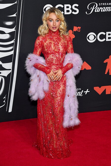 同樣擁有大膽作風的Sabrina Carpenter,這回則格外優雅。她穿上由Valentino創意總監Alessandro Michele為她打造的高級訂製服,紅色蕾絲刺繡兼具高雅和誘惑,淡紫色的皮草披巾則更添華麗氣場。