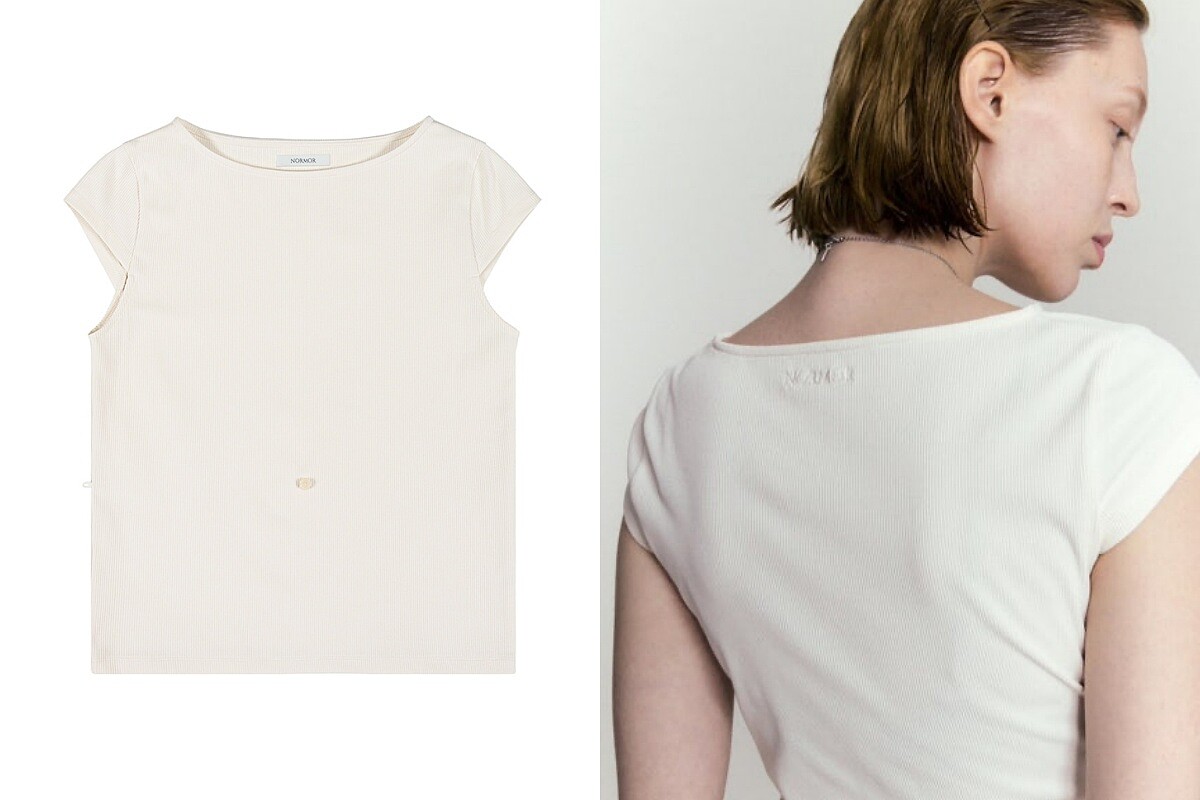 原來這件白色上衣是來自韓國新銳品牌Normor(노머)的單品,以「Normal, then more.」為理念的品牌,推出的單品都以適合日常的基本款為主,透過剪裁、布料與細節加入精緻的造型設計,讓服飾單品乍看簡約,近看又能在輪廓線條、皺褶處理與綁帶結構發現巧思,也是近年韓國年輕人與小眾設計愛好者關注的品牌之一。