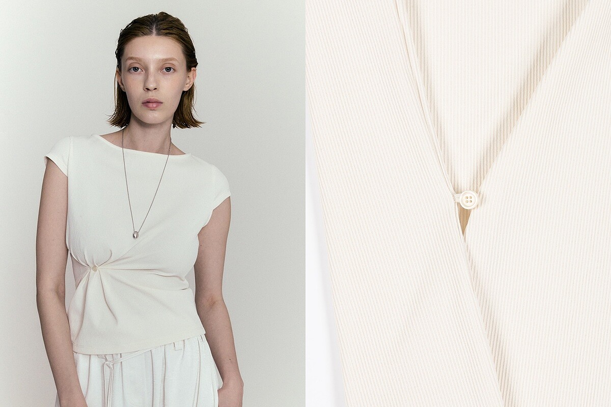 而潤娥穿著的這件短袖上衣,有著船型領的設計,搭配上稍短的小飛袖,最特別之處就在上衣側邊的扣繩與衣服中間的一顆鈕扣,可以當作一般短袖穿搭,或將扣子向側邊扣起後迅速的為上衣加入抓皺感,也就是這個細節讓這件上衣受到很高的詢問度,同時這件上衣的售價是韓幣五萬元,約台幣1,092元,算是很好入手的選擇。