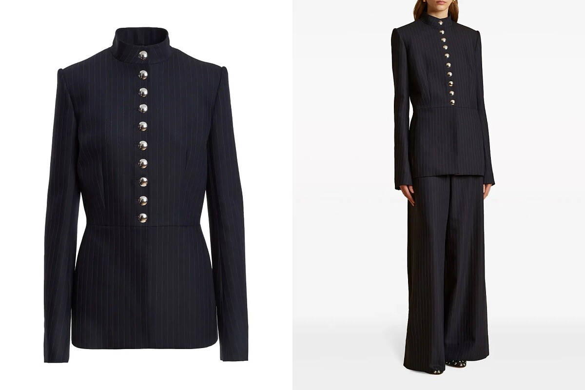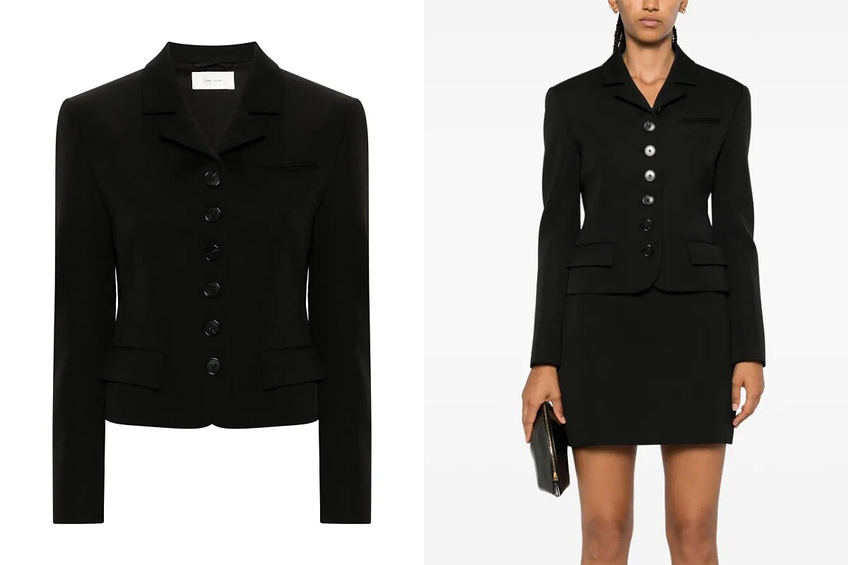 在新劇發布後,眼尖的網友紛紛開始詢問全智賢同款造型,其中一套黑色條紋的短高領鈕扣夾克更是成為熱搜,而這件夾克正式來自設計師品牌KHAITE的The Samuel條紋夾克,透過立領的合身剪裁與排扣設計,讓沈穩中也能有時髦感。