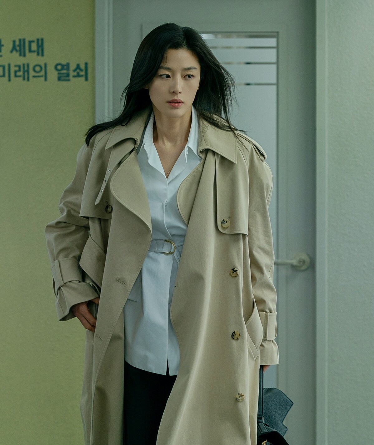 風衣在全智賢劇中的穿搭佔比也很高,其中同樣來自設計師品牌KHAITE的寬腰帶風衣也非常搶眼,內搭Valentino白色襯衫加入幹練元素,在全智賢173公分的高挑身形詮釋之下,颯爽的氣勢感十足。